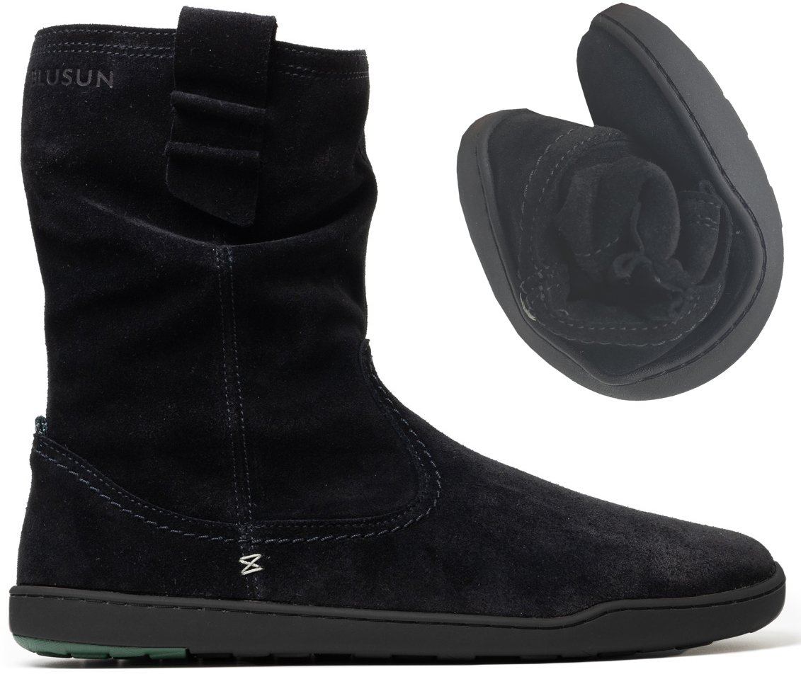 Schicker Wollgefütterter Barfußstiefel aus weichem in Deutschland gegerbtem Veloursleder für kühlere Tage BLSN-400W, ein moderner, leicht wasserabweisender Minimalschuh mit super quer und längs flexibler TPU Sohle, atmungsaktiv und fair produziert von BLUSUN für milde Herbst und nicht zu kalte Wintertage.