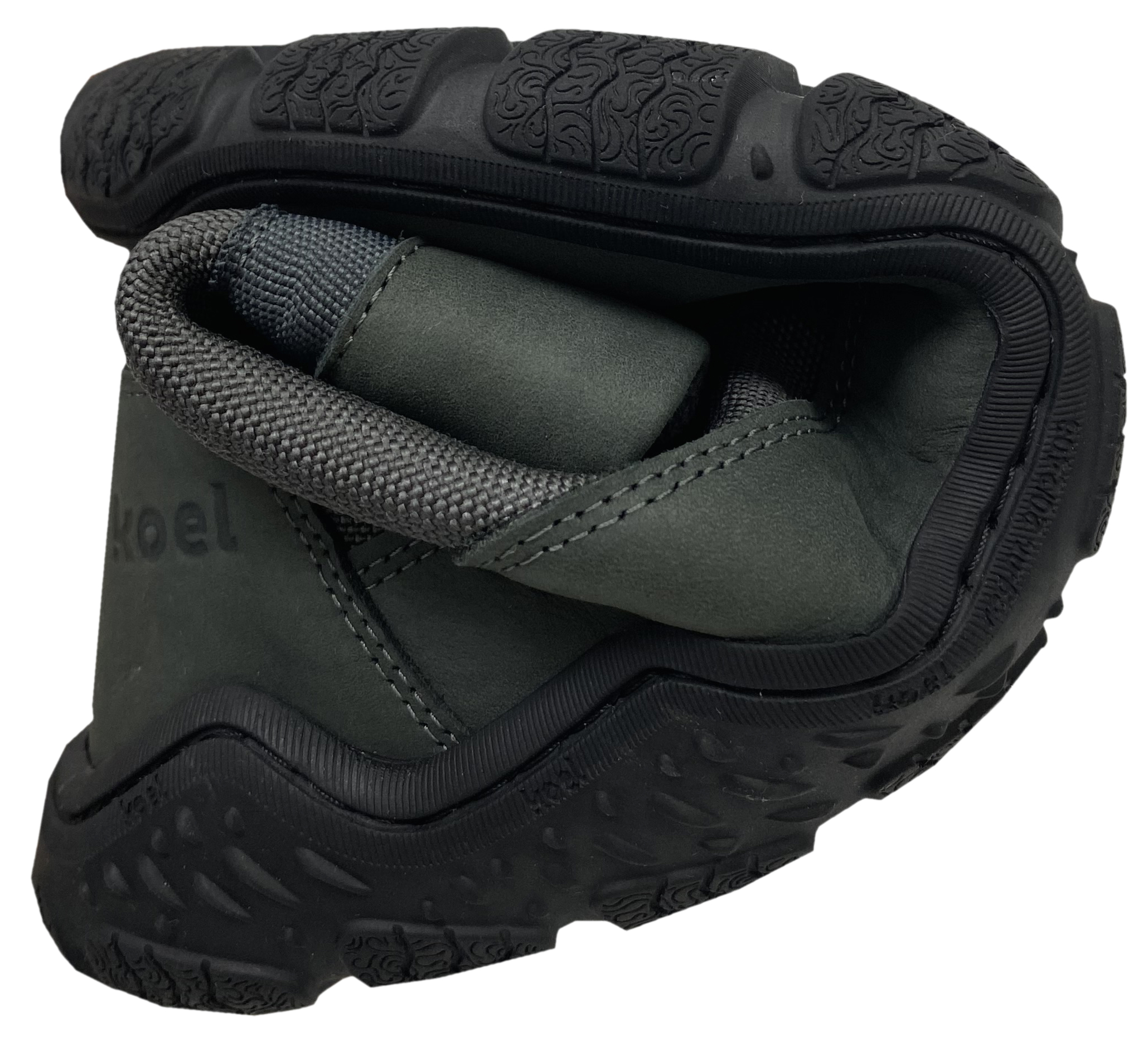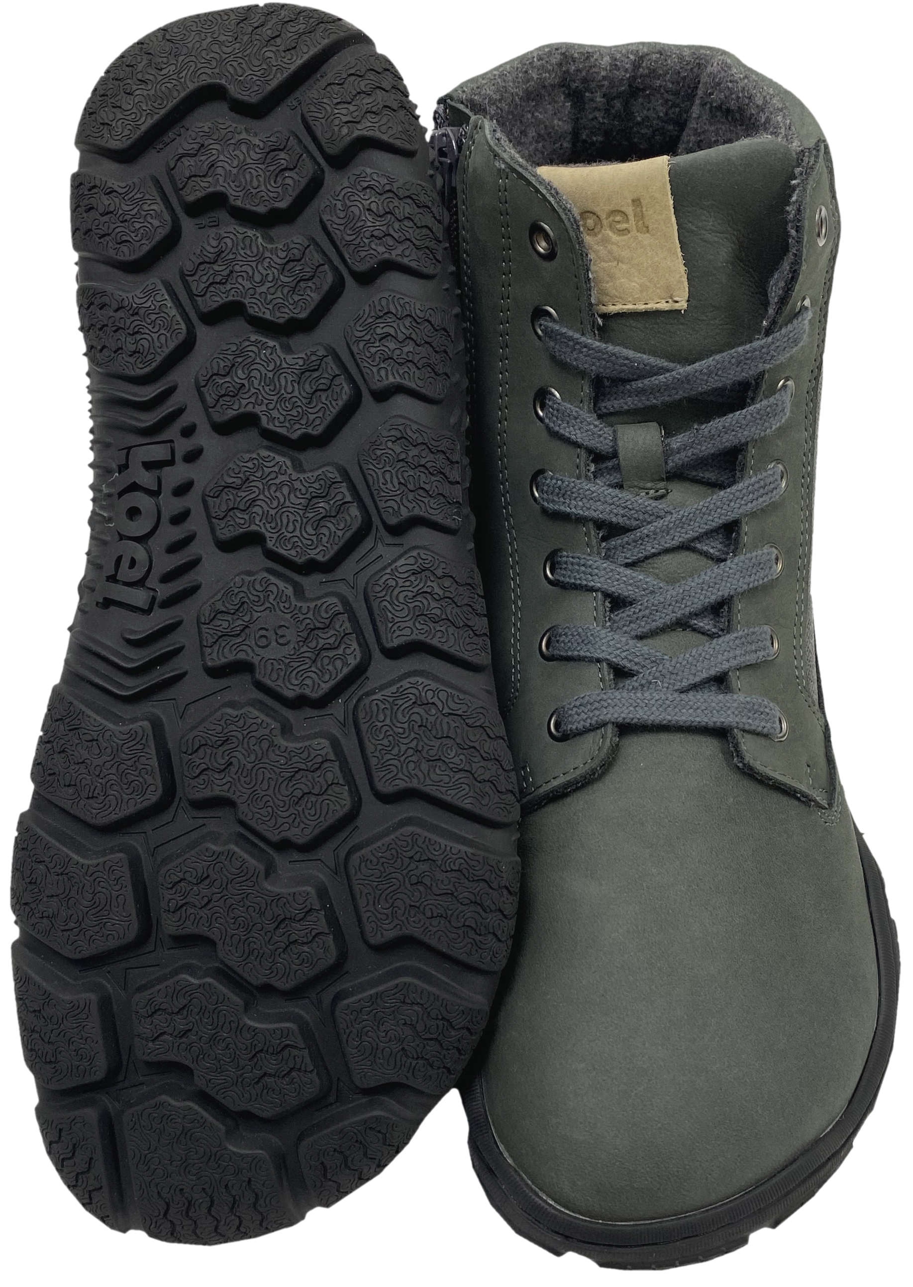 Derbe Barfußschuhe / Stiefeletten mit Merino Woll Futter, sehr gut quer und längs flexibler Gummisohle mit Trekking Profil, aus Hydrophobiertem Leder mit Mesh Besatz, herausnehmbare Innensohle mit Wollbezug, von KOEL Barefoot für große Füße.