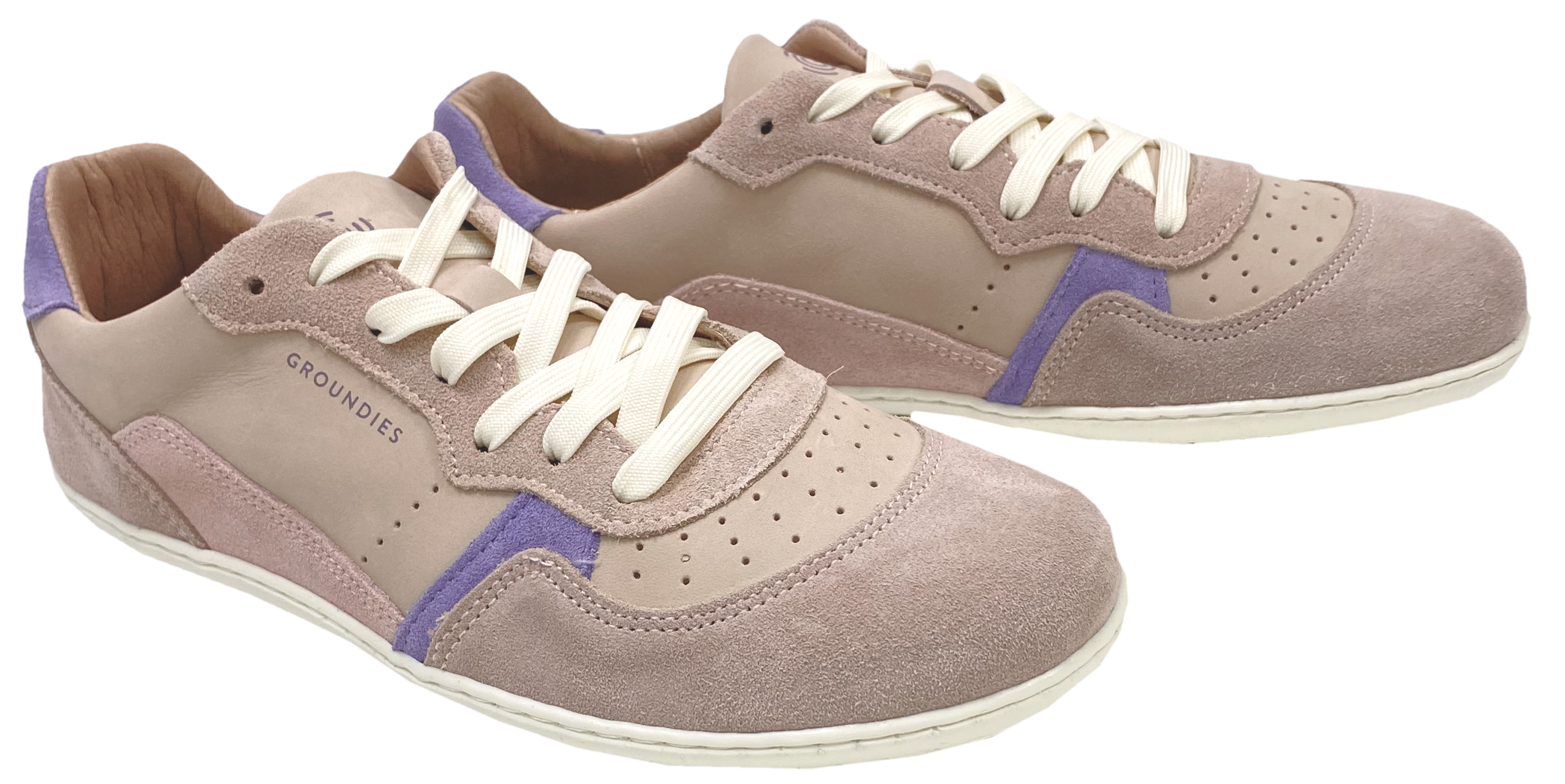Sportlich schicke Sneaker / Barfußschuhe aus Glatt und Velourleder Mix in Rose / Orchidee Tönen für Damen von GROUNDIES - Modell Nova auf der GO1 Sohle und der anatomisch geformten Zehenbox, dem komplett neutralem Fußbett ohne jegliche Erhöhungen - für ein bequemes Barfuß - laufen - Gefühl.