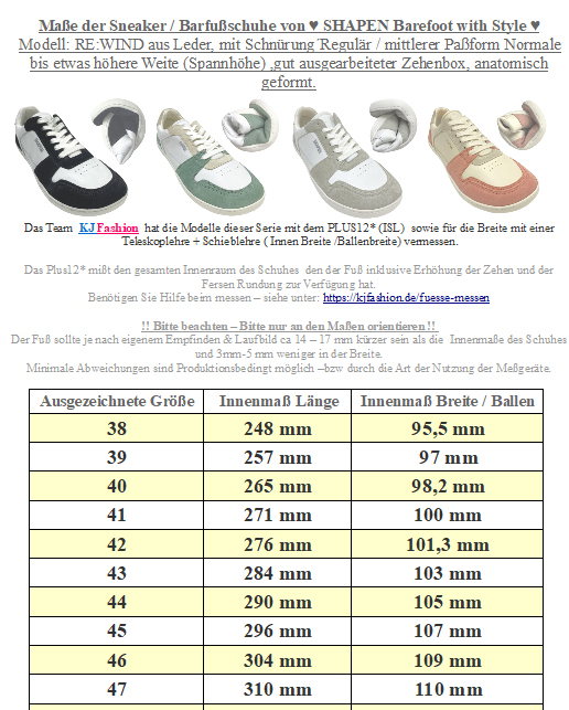 Weite (diese bezieht sich auf das Volumen): für normal hohen bis minimal höheren Spann geeignet | Leiste (Stehfläche Fuß) Normal | Mittelfuß: normal | Ferse: normal bis etwas schmaler | Zehenbox: breit gerundet, anatomische Form, für dominanten Großzeh geeignet