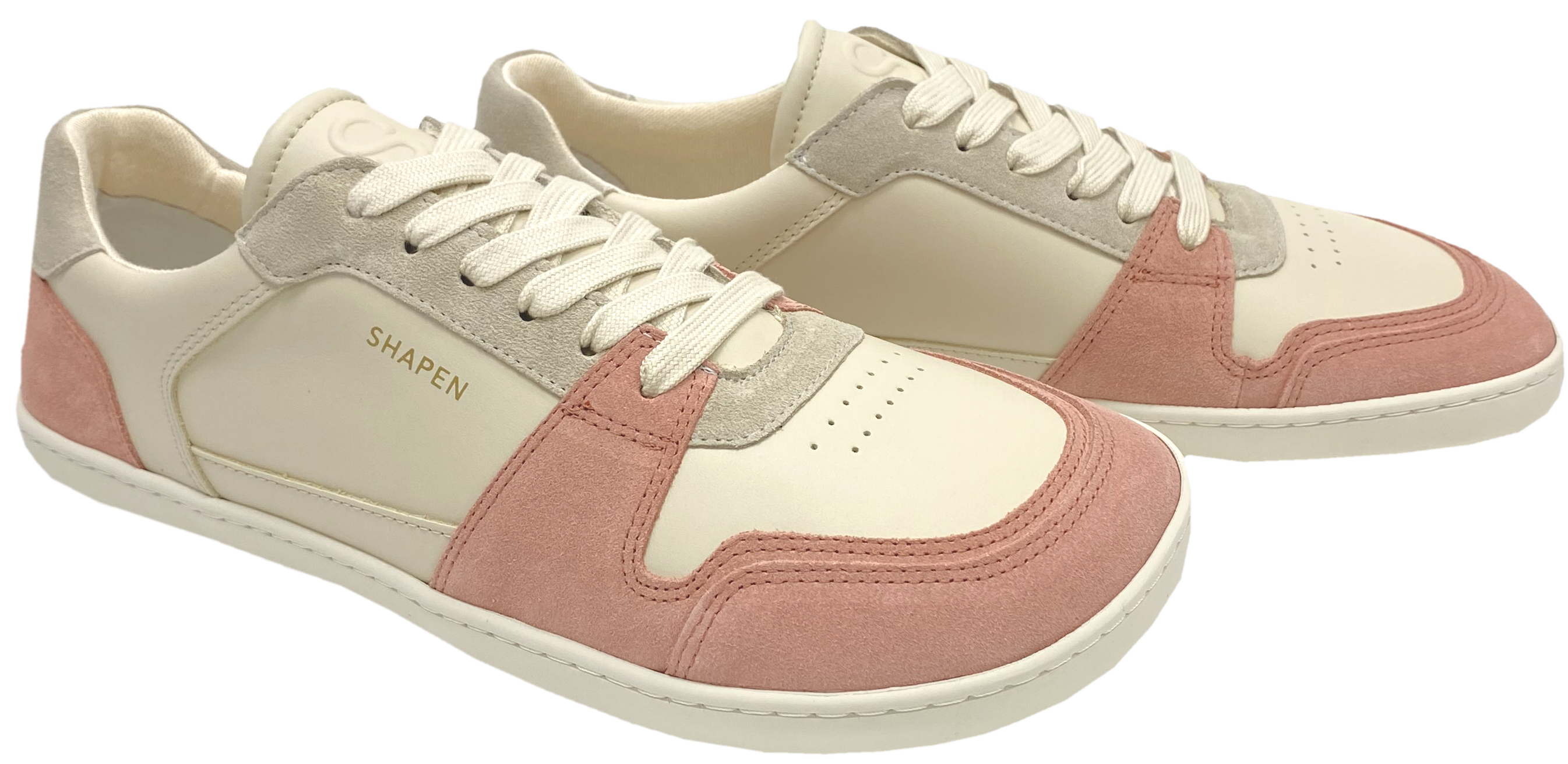 Stylischer, und super bequemer Sneaker aus Leder mit einer absolut weichen, quer und längs fexiblen Gummisohle, in mattem weiß mit Veloursleder Besatz in Peach / Creme und Beige von SHAPEN Barefoot aus der Slowakai, hergestellt in Portugal.