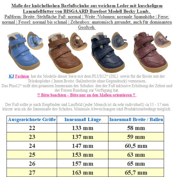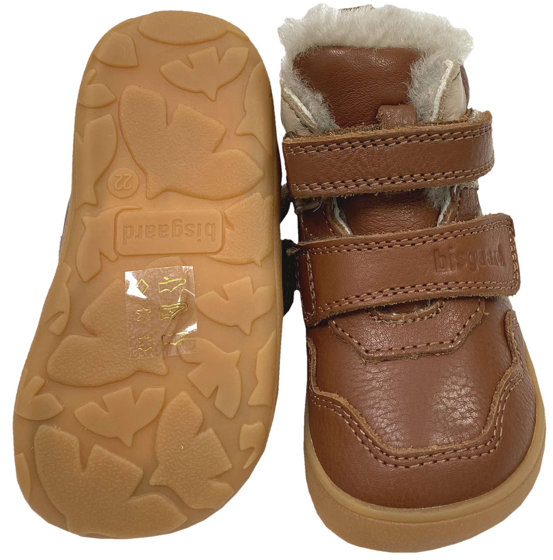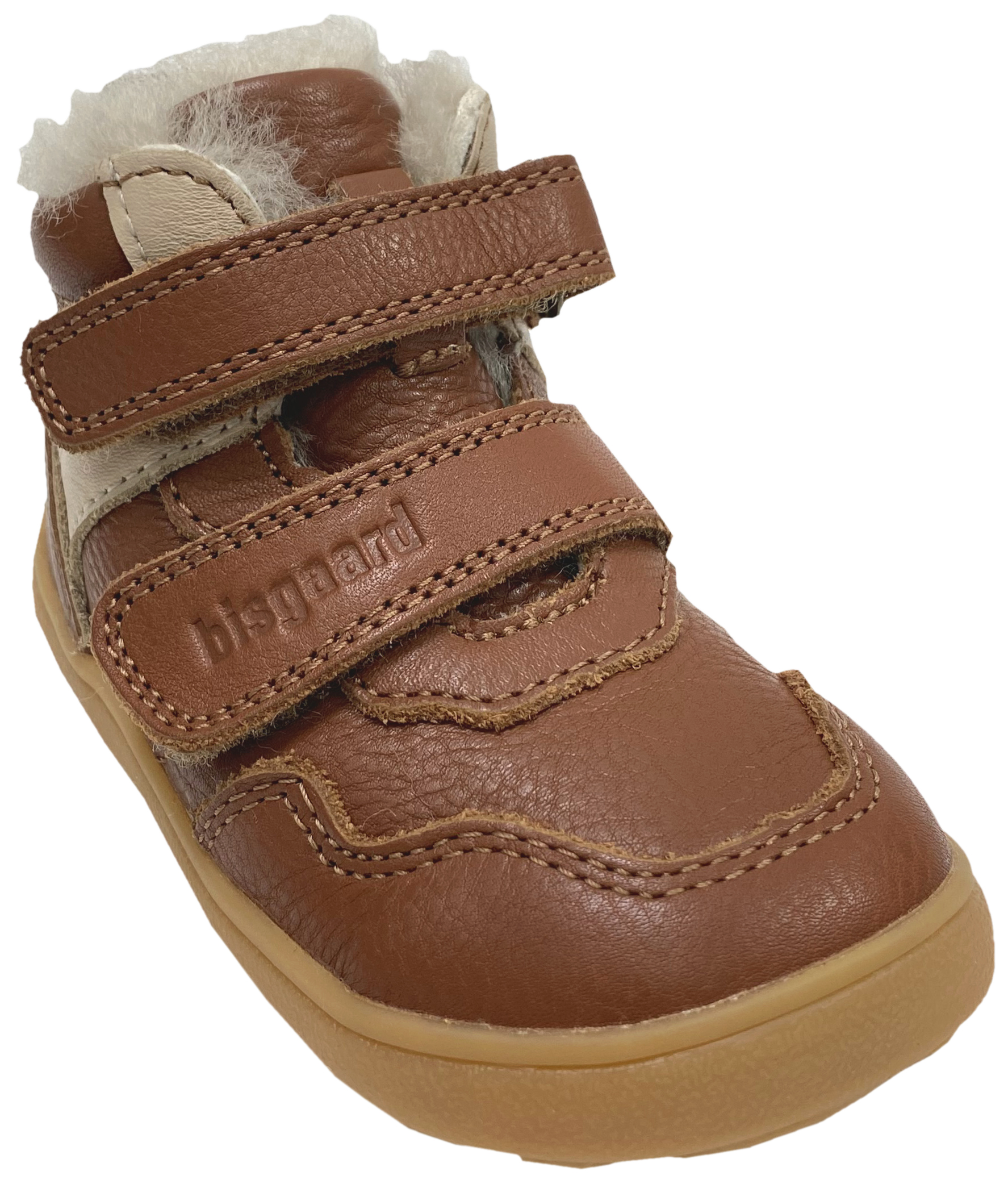 Warm haltende Minimalschuhe / Barfußschuhe mit kuscheligem Lammfell gefüttert, bis über den Knöchel gehend aus weichem, LWG zertifiziertem Nappaleder, mit quer und längs flexibler Minimalsohle aus Naturkautschuk und praktischem Doppelklett, aus der Barefoot-Linie von dem dänischen Hersteller BISGAARD.