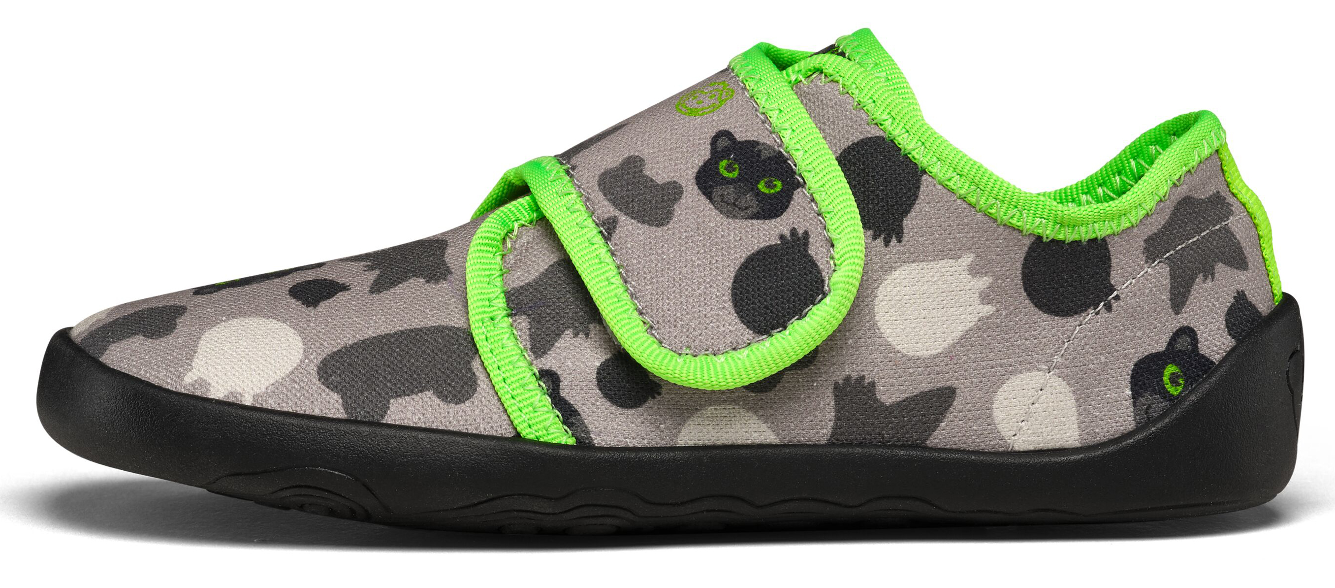 Super weicher, leichter Hausschuh in flacher Low Cut Höhe mit breitem Klettriegel zu schließen, aus robustem Canvas / Baumwolle, mit sehr flexibler Barfußsohle von AFFENZAHN - Modell Slipper Cotton Movy.