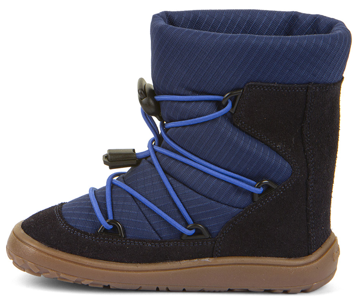 Die robusten Winterstiefel / Minimalschuhe von FRODDO vereinen maximale Flexibilität und Barfußkomfort mit wärmendem, nicht zu voluminösem Schurwollfutter, Tex Membran und praktischer Elastikschnürung – perfekt für kleine Abenteurer an kalten, nassen Wintertagen.