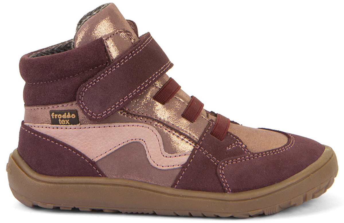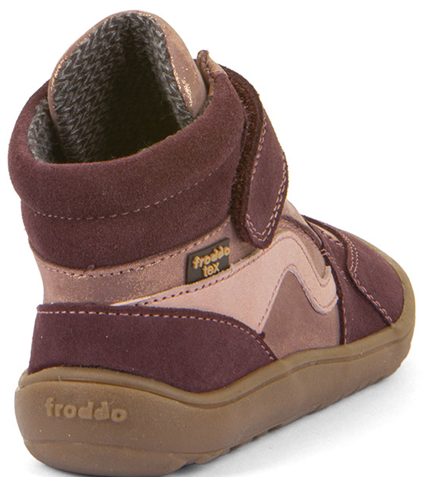 Halbhohe Barfußschuh mit anatomischer Zehenbox, Nullabsatz und Minimalsohle mit gutem Gripp, aus weichem Leder und einer Tex Membran zwischen den beiden Materialschichten, mit einem breiten Klett optimal an die Fessel anzupassen, über dem Mittelfuß mit einem Elastikband, innen mit angenehm zu tragendem Textil Futter ( kein dickes Winterfutter ) ausgelegt, für Kids von dem kroatischen Schuhhersteller FRODDO.