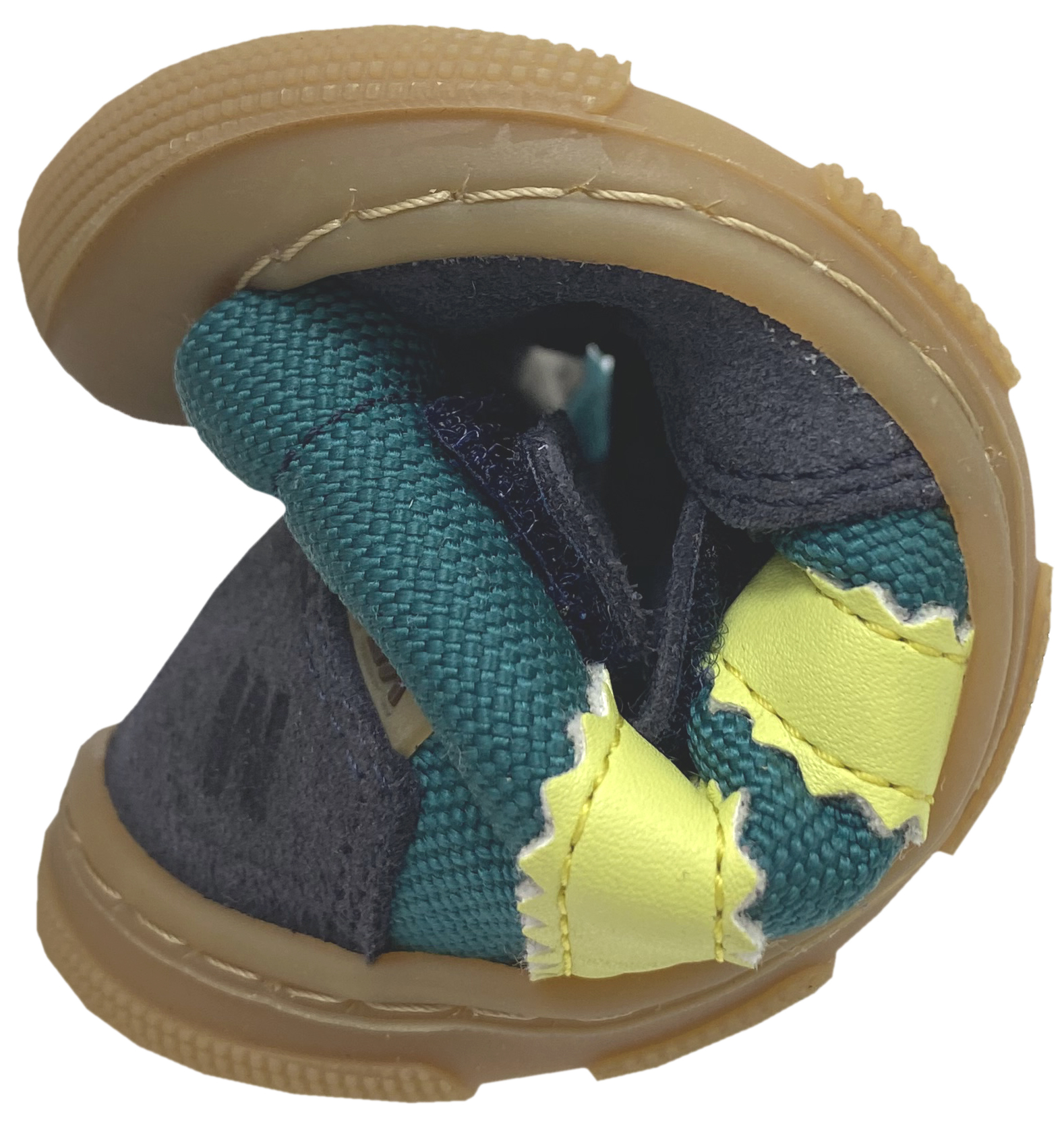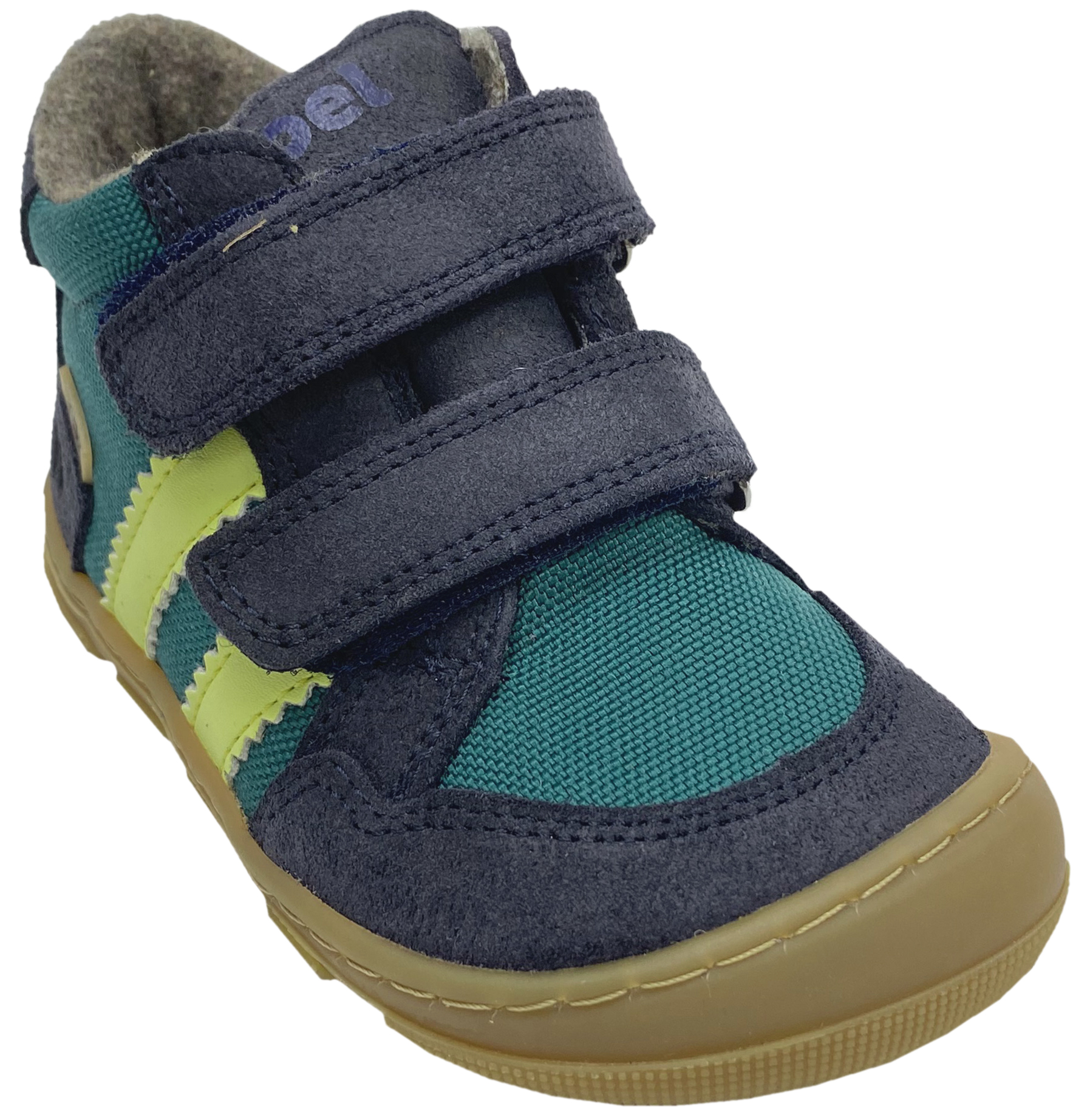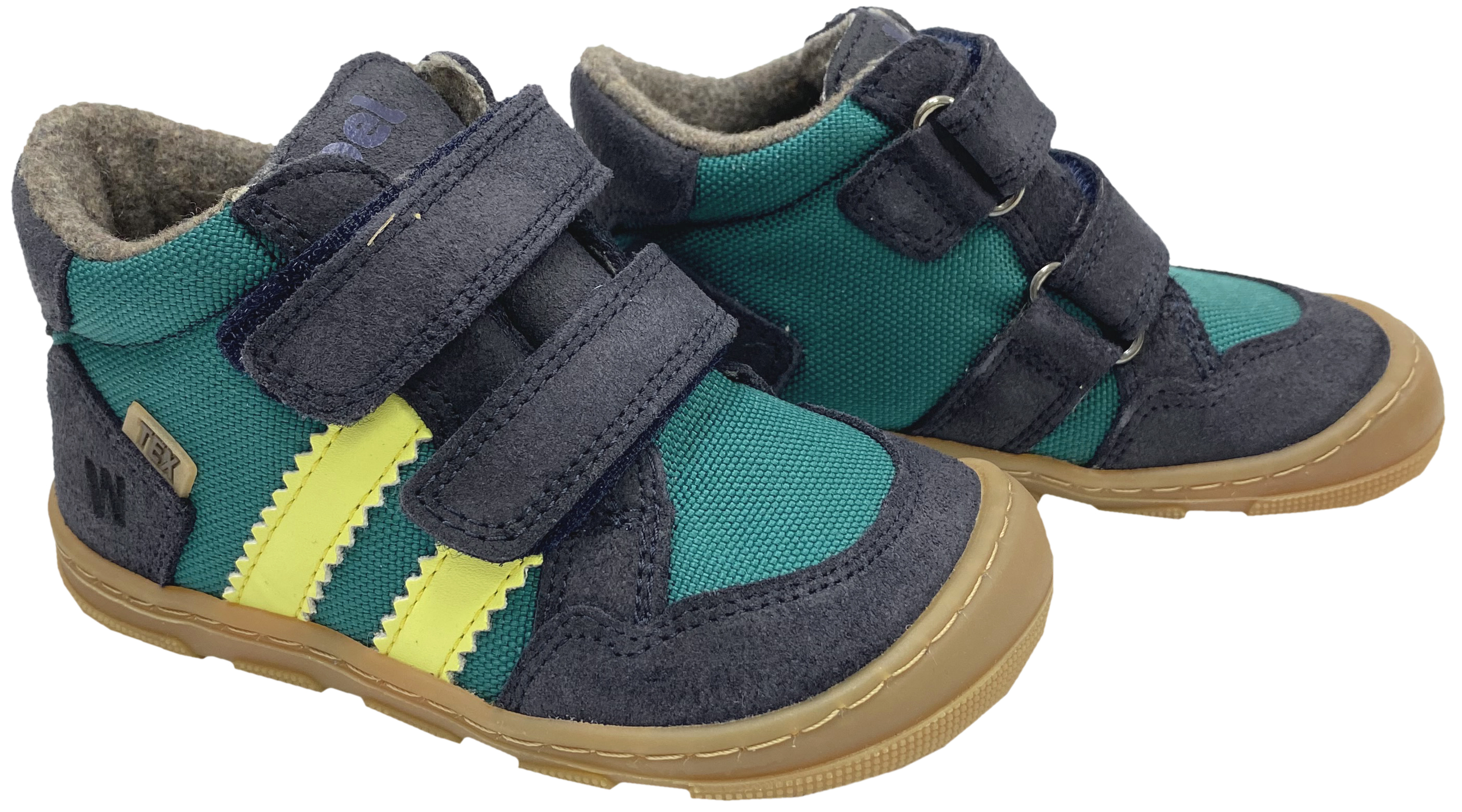 Robuste Barfußschuhe mit Tex Membran in halbhoher Form aus Cordura, Nubukleder mit TEX Membran, mit Doppelklett zu öffnen, innen mit warm haltendem, nicht zu dickem Wollfilz Futter gearbeitet, quer und längs flexibler Gummigrippsohle auf dem Extra breiten Leisten, mit etwas mehr Volumen im Spann Bereich ( Weite) von KOEL Barefoot.