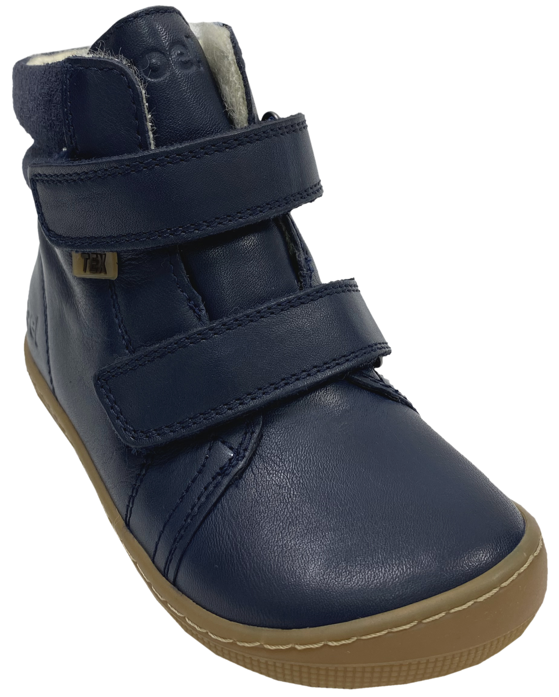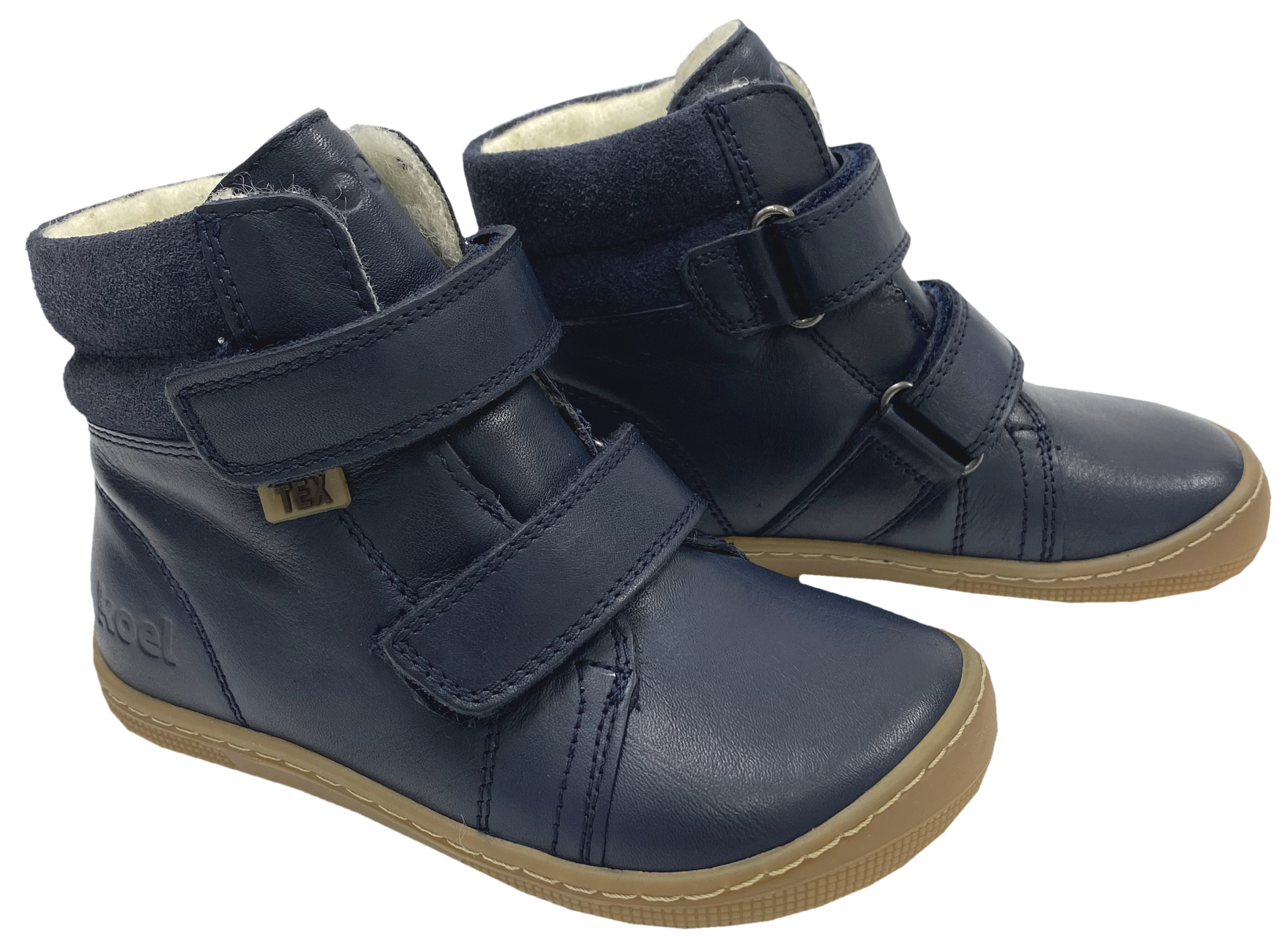 Robuste Barfußschuhe / Winterstiefel mit Tex Membran aus Glattleder mit Doppelklett zu öffnen, innen mit Schurwollfutter ausgelegt, minimal quer und längs flexible Gummigrippsohle auf dem mittelbreiten Leisten ( breite Zehenbox, normale Paßform) von KOEL Barefoot.