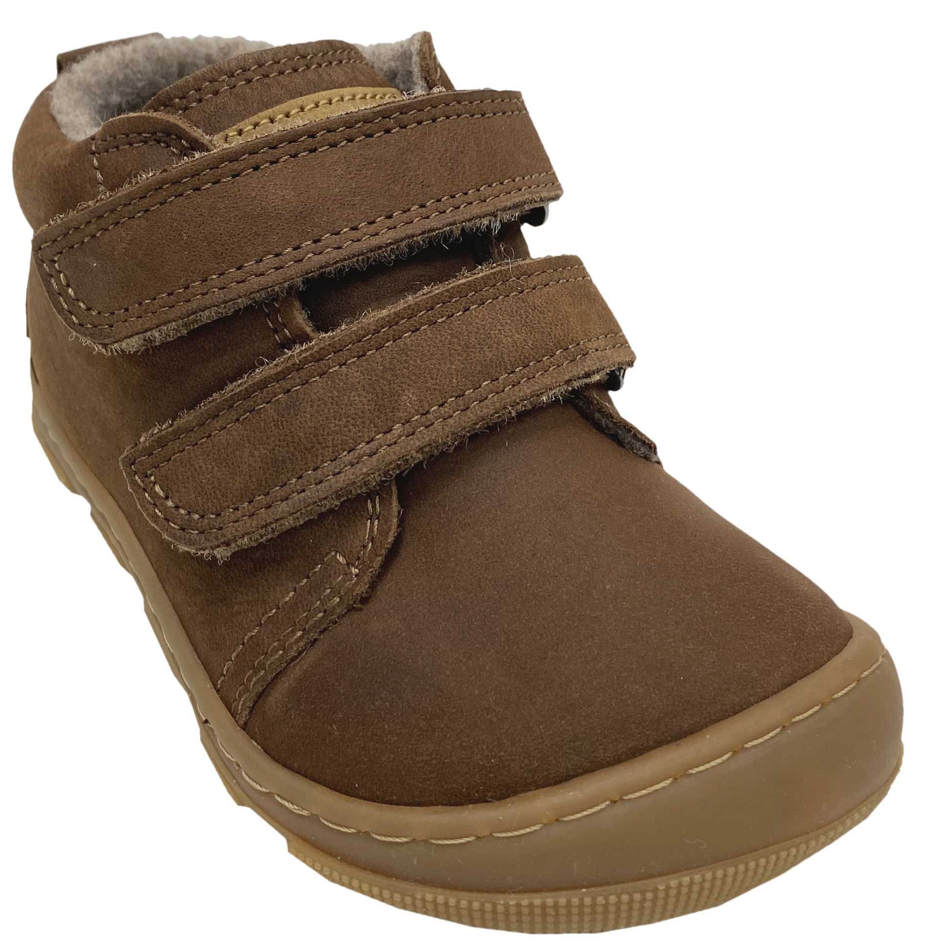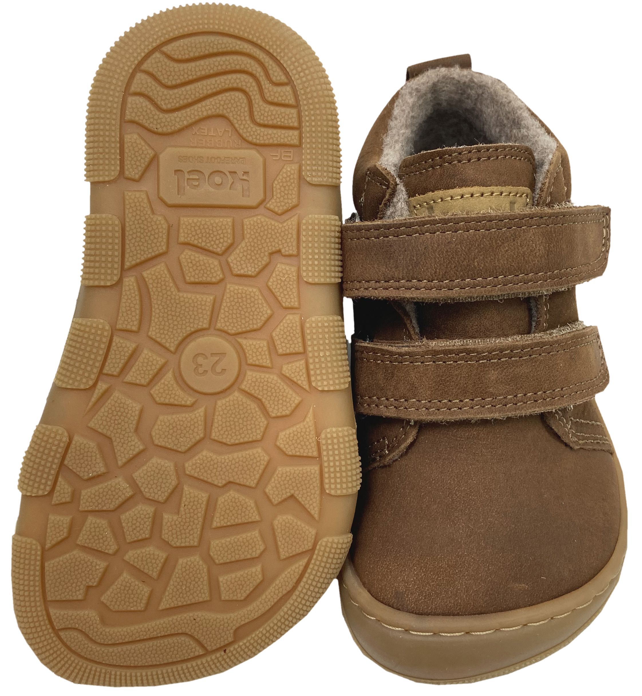 Quer- und längsflexible Barfuß-Halbschuhe von KOEL Barefoot in Mid-Top-Höhe aus weichem, hydrophobiertem Kalbsleder mit weichem, nicht zu dickem Wollfleece Futter. Die extra weite & Breitere Barefoot+ Passform, die Profil Sohle und der Doppelklettverschluss bieten optimalen Halt und Komfort für kräftige Kinderfüße.