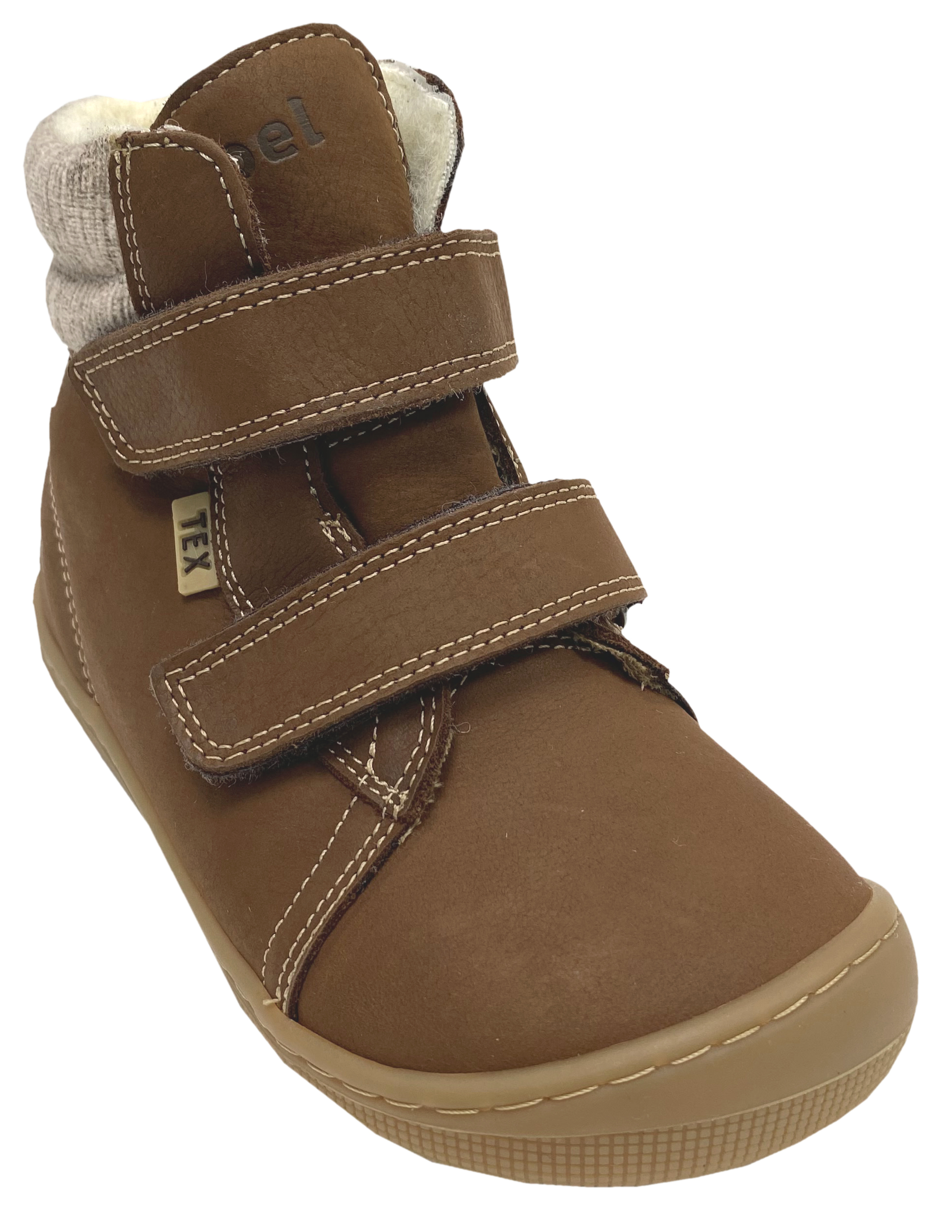 Robuste Barfußschuhe / Winterstiefel mit Tex Membran aus hydrophobiertem Leder und einem Besatz am Einstieg aus samtigem Textil wie Cord im Griff, mit Doppelklett zu öffnen, innen mit Schurwollfutter ausgelegt, minimal quer und längs flexible Gummigrippsohle auf dem mittelbreiten Leisten ( breite Zehenbox, normale Paßform) von KOEL Barefoot.