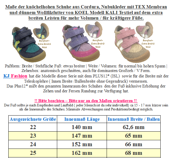 Robuste Barfußschuhe mit Tex Membran in halbhoher Form aus Cordura, Nubukleder mit TEX Membran, mit Doppelklett zu öffnen, innen mit warm haltendem, nicht zu dickem Wollfilz Futter gearbeitet, quer und längs flexibler Gummigrippsohle auf dem Extra breiten Leisten, mit etwas mehr Volumen im Spann Bereich ( Weite) von KOEL Barefoot.