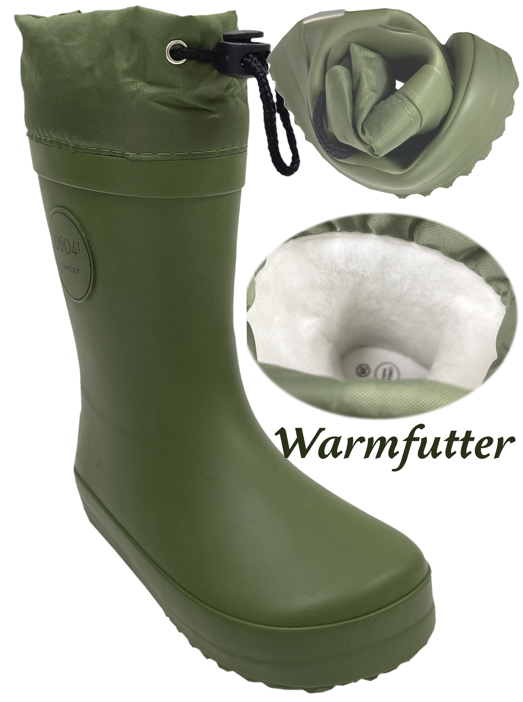 Weicher und flexibler Gummistiefel mit Warmfutter, herausnehmbarer textiler Innensohle ( Optional auszuwecheln gegen eine dicke Lammwoll-, Thermo- oder Wollsohle ) in anliegender, nicht zu weiter Mittelschafthöhe mit Stulpe, anatomisch geformter Zehenbox zum ausgelassenen Pfützenspringen an kühleren Tagen mit quer und längs flexibler Minimalsohle von 0904! Barefoot.
