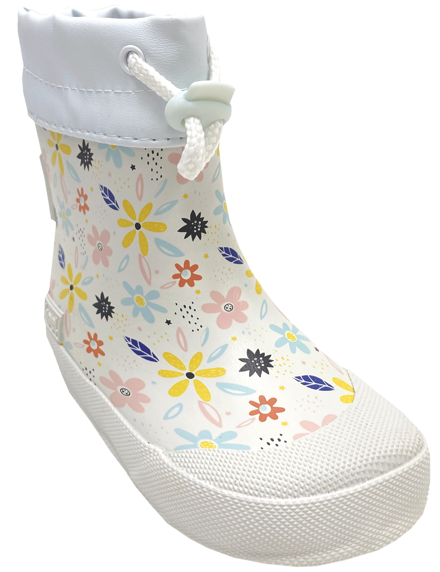 Extrem knautschiger und flexibler Kurzschaft Gummistiefel / Wellie für die kleinsten Läufer, zum ausgelassenen Pfützenspringen, aus leichtem Kautschuk mit anatomischer, breiter Zehenbox, Nullabsatz, Verstärkung als Schutz auf dem Zehenbereich und der Ferse, mit breiter Krempe und Kordel zum regulieren an der Wade von KOEL Barefoot.