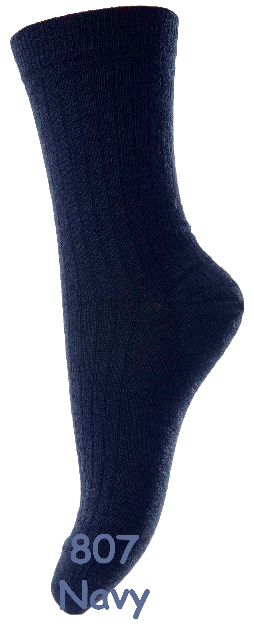 Uni-farbene, gerippte Wollsocke mit mittlerer Schafthöhe, für optimalen Sitz an den Waden der Kinder, ohne einzuschneiden. Aus weicher, angenehmer Merino-Wolle, die Feuchtigkeit effektiv vom Fuß wegtransportiert und diesen so länger warm hält, hergestellt von MP Denmark