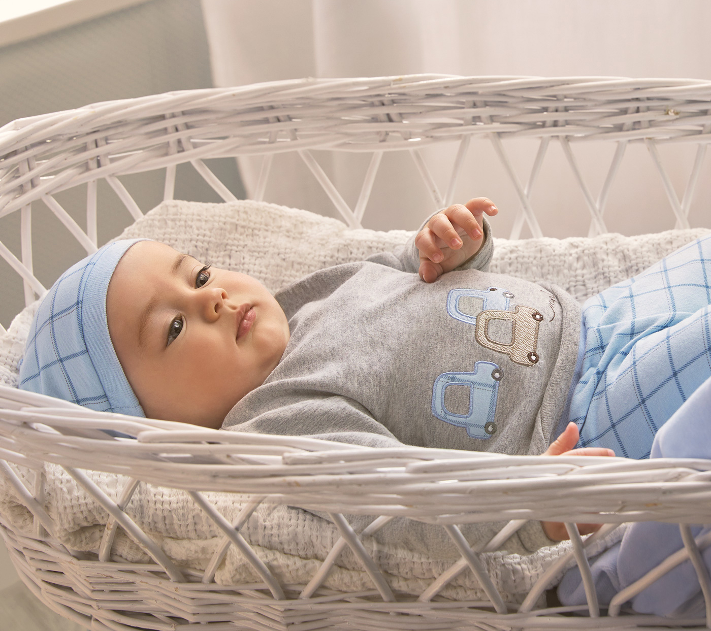Schickes ganz klassisch gehaltenes und absolut bequemes Baby Boy Set in einem hellen Grau Melange und einem zarten Babyblau aus ganz weichem , innen kuschelig gerauhtem Baumwollsweat, bestehend aus einem seitlich knöpfbarem Sweater, einer Strampelhose mit Fuß und der passenden Topfmütze von dem spanischen Nr 1 Label für hochwertige Kindermode.