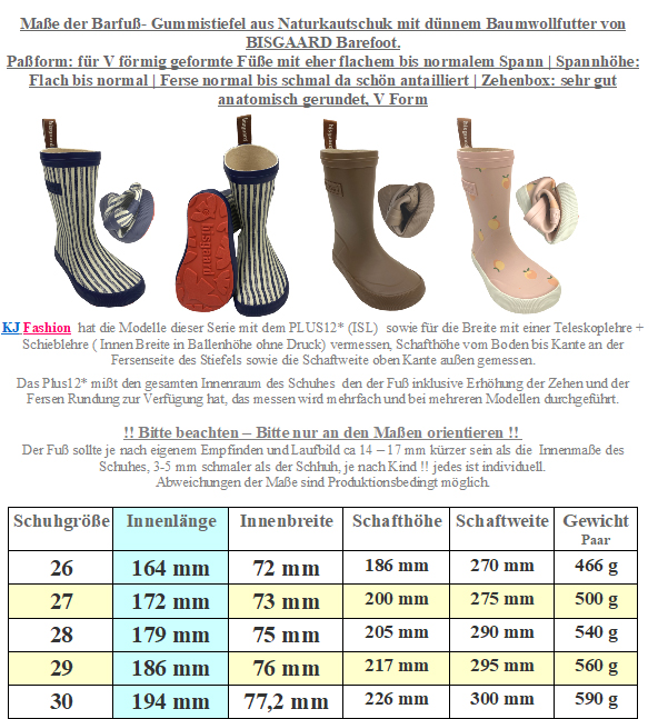 Super weicher und flexibler Gummistiefel mit hohem Schaft ohne störende Stulpe mit sehr gut anatomisch geformter Zehenbox ( Fußform V förmig ) zum ausgelassenen Pfützenspringen, keiner Erhöhung / Sprengung in der Sohle, mit super quer und längs flexibler, dünner Barfußsohle von dem dänischen Label BISGAARD aus der Barefoot Kollektion.