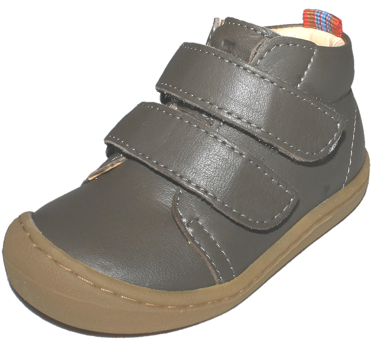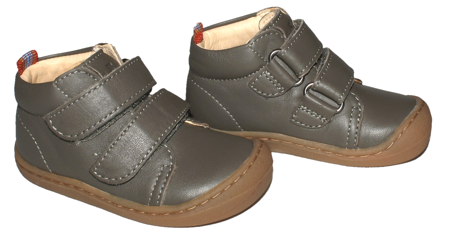 Normale Halbschuh, bis zum Knöchel des Fußes gehend, mit breiten Klettverschlüssen zum einfachen anziehen in einem matten Steingrau.