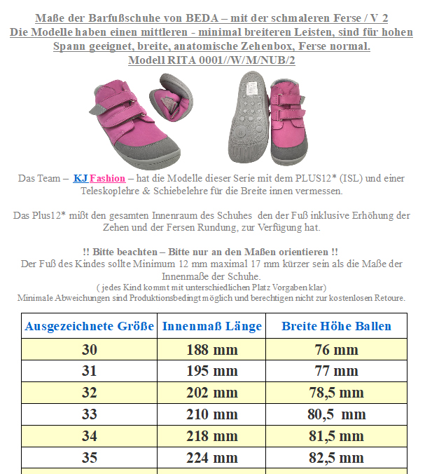 Weite (diese bezieht sich auf das Volumen / Spannhöhe ) für etwas höheren Spann geeignet | Leiste (Stehfläche Fuß) Mittel bis etwas breiter (s.Maße) | Mittelfuß: Normal bis etwas breiter | Ferse: V2 Serie ( etwas schmaler im Vergleich) | Zehenbox: gerundet, anatomische Form