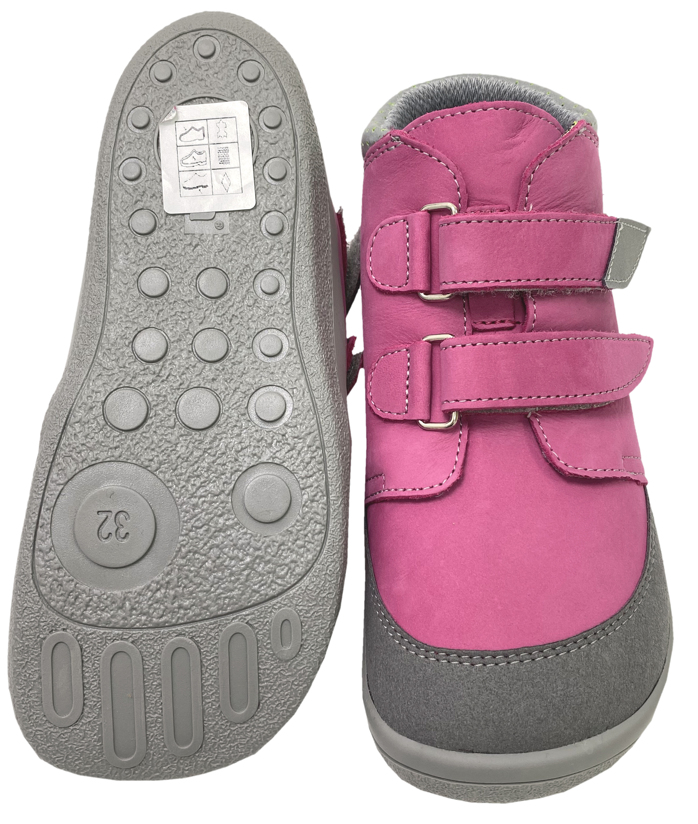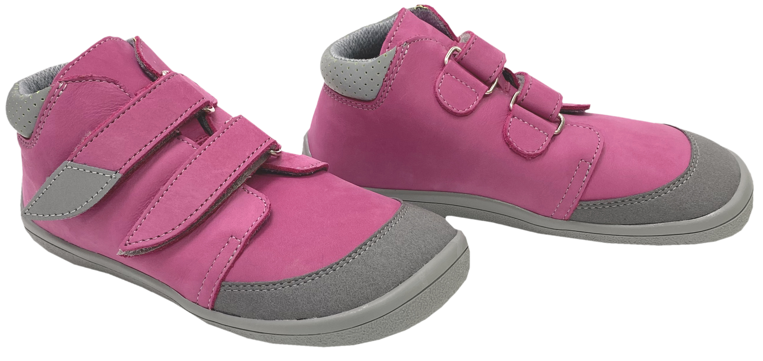 Robuste Barfußschuhe / Halbschuhe aus weichem Nubukleder mit reflektierenden Einsätzen am Klett und der Ferse, mit einer stark wasserabweisenden TEX Membran - TE POR - gearbeitet, V2 Linie mit etwas schmalerer Ferse, in kräftigem PINK mit Einsatz in Grau für Kids von dem Tschechischem Hersteller BEDA.