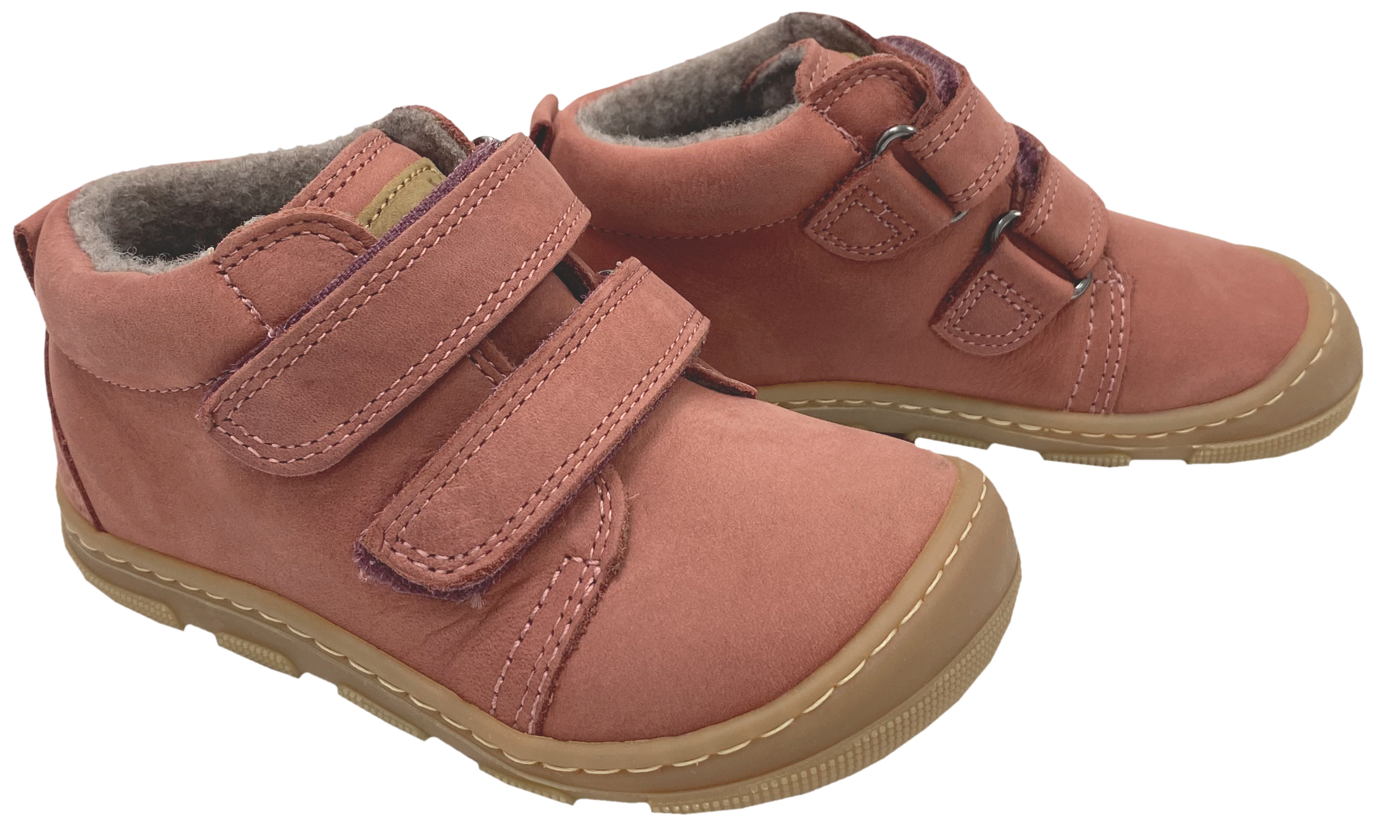Quer- und längsflexible Barfuß-Halbschuhe von KOEL Barefoot in Mid-Top-Höhe aus weichem, hydrophobiertem Kalbsleder mit weichem, nicht zu dickem Wollfleece Futter. Die extra weite & Breitere Barefoot+ Passform, die Profil Sohle und der Doppelklettverschluss bieten optimalen Halt und Komfort für kräftige Kinderfüße.