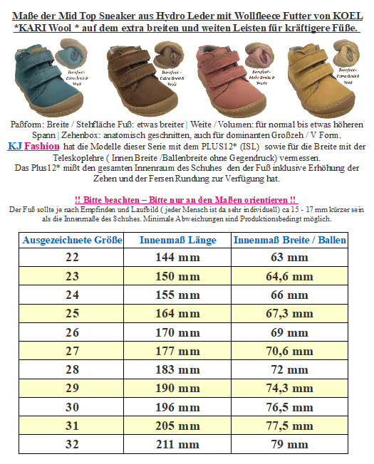 Robuste Barfußschuhe mit Tex Membran in halbhoher Form aus Leder mit Doppelklett zu öffnen, innen mit warm haltendem, nicht zu dickem Merino Wollfilz Futter gearbeitet, minimal quer und längs flexible Gummigrippsohle auf dem Extra breiten Leisten, mit etwas mehr Volumen im Spann Bereich ( Weite) von KOEL Barefoot. > Bitte beachten Sie die im Bild angegebenen Maße, um unnötige Rücksendungen zu vermeiden. Bei Fragen wenden Sie sich gerne vor dem Kauf per E-Mail an uns. Ihr Team KJ Fashion! < Modell: KALI Suede 15T007.305 - 870 TaupeMaterial: verschiedene echt Leder - stark Wasserabweisend dank Tex Membran zwischen den beiden Schichten | Innen: Merinowolle gefilzt | Sohle: GummiWeite ( diese bezieht sich auf das Volumen ) für einen mittleren bis höheren Spann geeignet | Leisten -Breite (Stehfläche Fuß) normal bis breit | Mittelfuß: etwas breiter | Ferse: normal bis etwas breiter | Zehenbox: anatomisch gerundet geformt - Barfußschuhe für kühlere Tage, in halbhoher Form bis über den Gelenkknöchel hinaus gehend - abgepolsterter Einstieg, innen mit weichem nicht zu dickem Wollfilz ausgelegt, zwischen den beiden Materialien mit einer Tex Membran gearbeitet ( Bitte beachten das Tex Membran nur funktionieren wenn es außen kälter als im Schuh ist, und diese GUT durchtrocknen kann ) - mit zwei breiten Klettstreifen zu öffnen, optimal an den Fuß anzupassen - herausnehmbare, mit Wollfilz bezogene Innensohle - flexible Gummisohle mit gutem Gripp Profil, durch das Futter sowie die TEX Membran ist die Sohle weniger knautschig weich als Modelle ohne Futter und ohne Tex - an der Spitze im Zehenbereich ist die Sohle hochgezogen als Schutzkante Der optimale Schuh für den milden Winter und den Übergang von KOEL Barefoot. !! Bitte beachten - für extreme Nutzung durch Bobby Car / Laufrad / krabbeln mit der Spitze etc bitte geeeignete Schutzkappen über die Schuhe ziehen - da diese dafür nicht ausgelegt sind !! !! TIP bei kalten Füßen - tragen sie am besten Socken die nicht zu eng am Fuß sitzen aus Wolle, da diese sich am Fuß des Kindes nicht so schnell feucht und sich damit kalt anfühlen wie eine Socke aus Baumwolle - auch Funktionssocken leiten die Feuchtigkeit des Fußes hervorragend ab, so das das Kind nicht so schnell kalte Füße durch feuchte Socken bekommt -> Hier geht es zu unseren Woll und Funktionssocken <