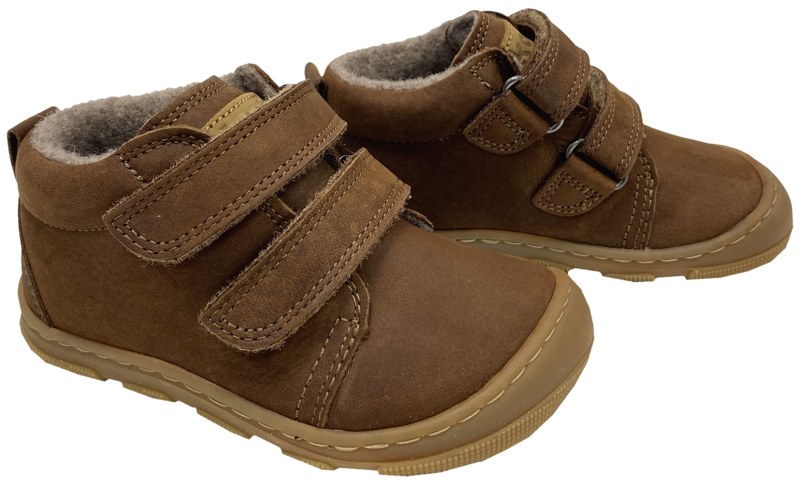 Quer- und längsflexible Barfuß-Halbschuhe von KOEL Barefoot in Mid-Top-Höhe aus weichem, hydrophobiertem Kalbsleder mit weichem, nicht zu dickem Wollfleece Futter. Die extra weite & Breitere Barefoot+ Passform, die Profil Sohle und der Doppelklettverschluss bieten optimalen Halt und Komfort für kräftige Kinderfüße.