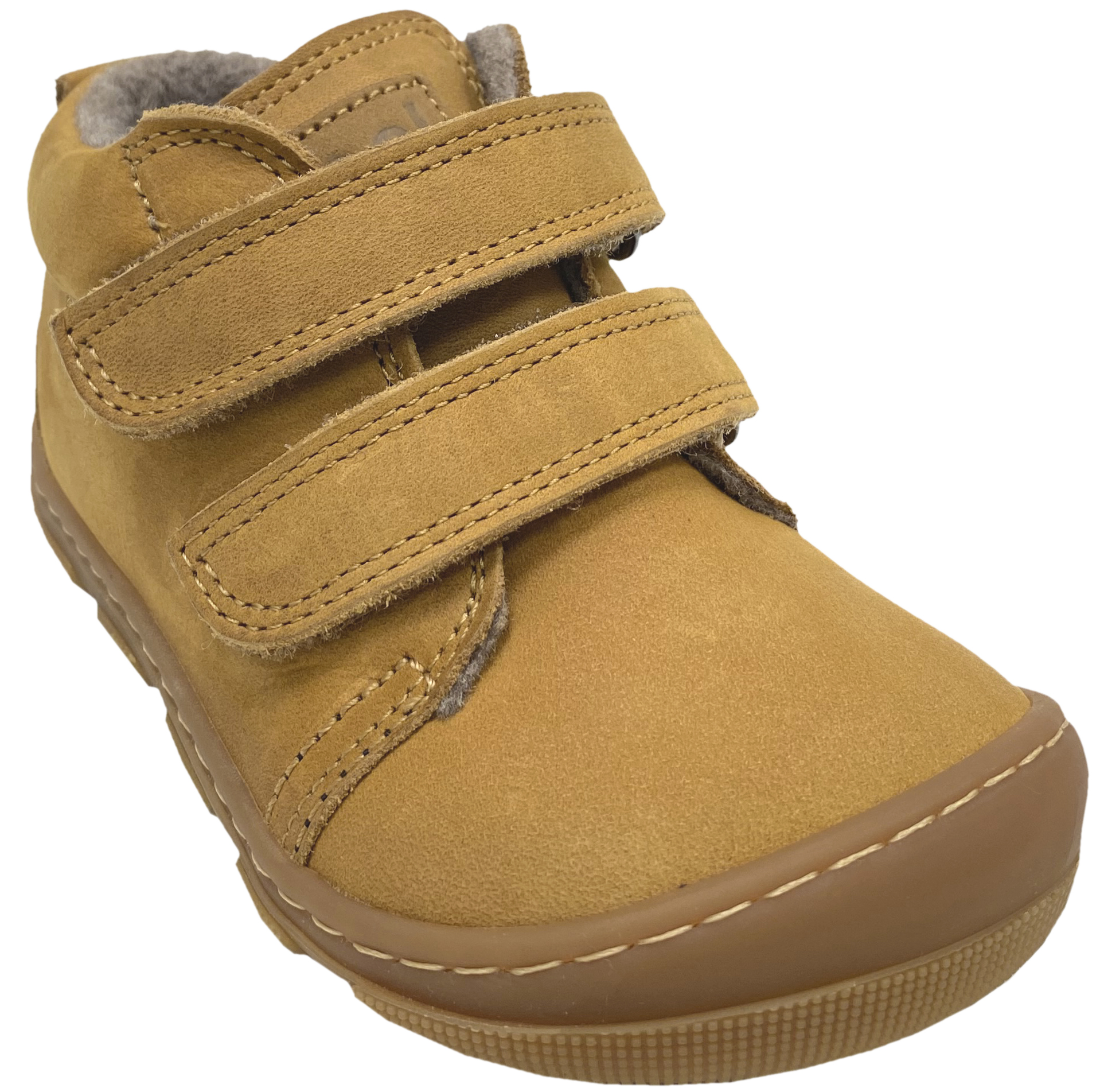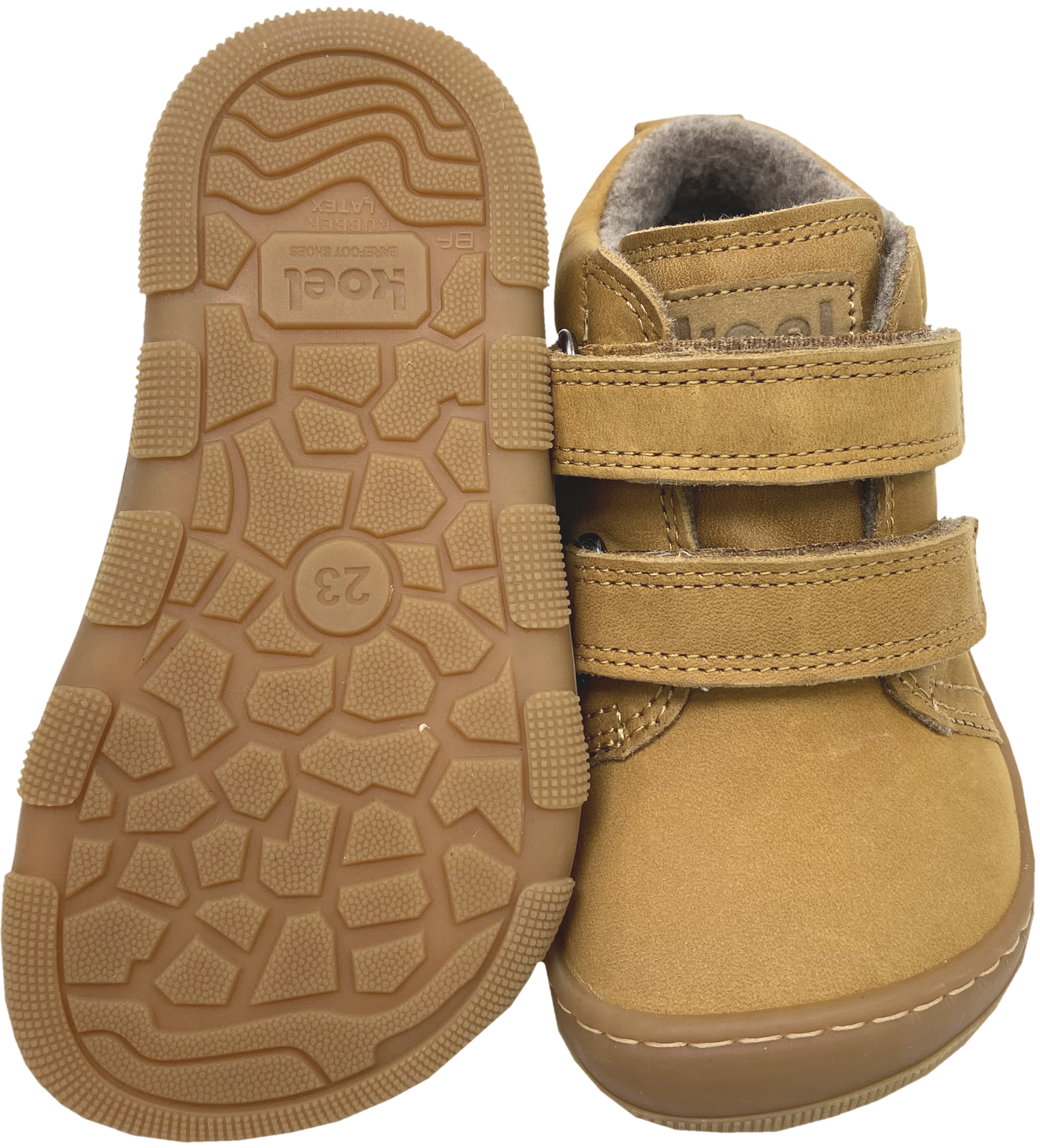 Quer- und längsflexible Barfuß-Halbschuhe von KOEL Barefoot in Mid-Top-Höhe aus weichem, hydrophobiertem Kalbsleder mit weichem, nicht zu dickem Wollfleece Futter. Die extra weite & Breitere Barefoot+ Passform, die Profil Sohle und der Doppelklettverschluss bieten optimalen Halt und Komfort für kräftige Kinderfüße.