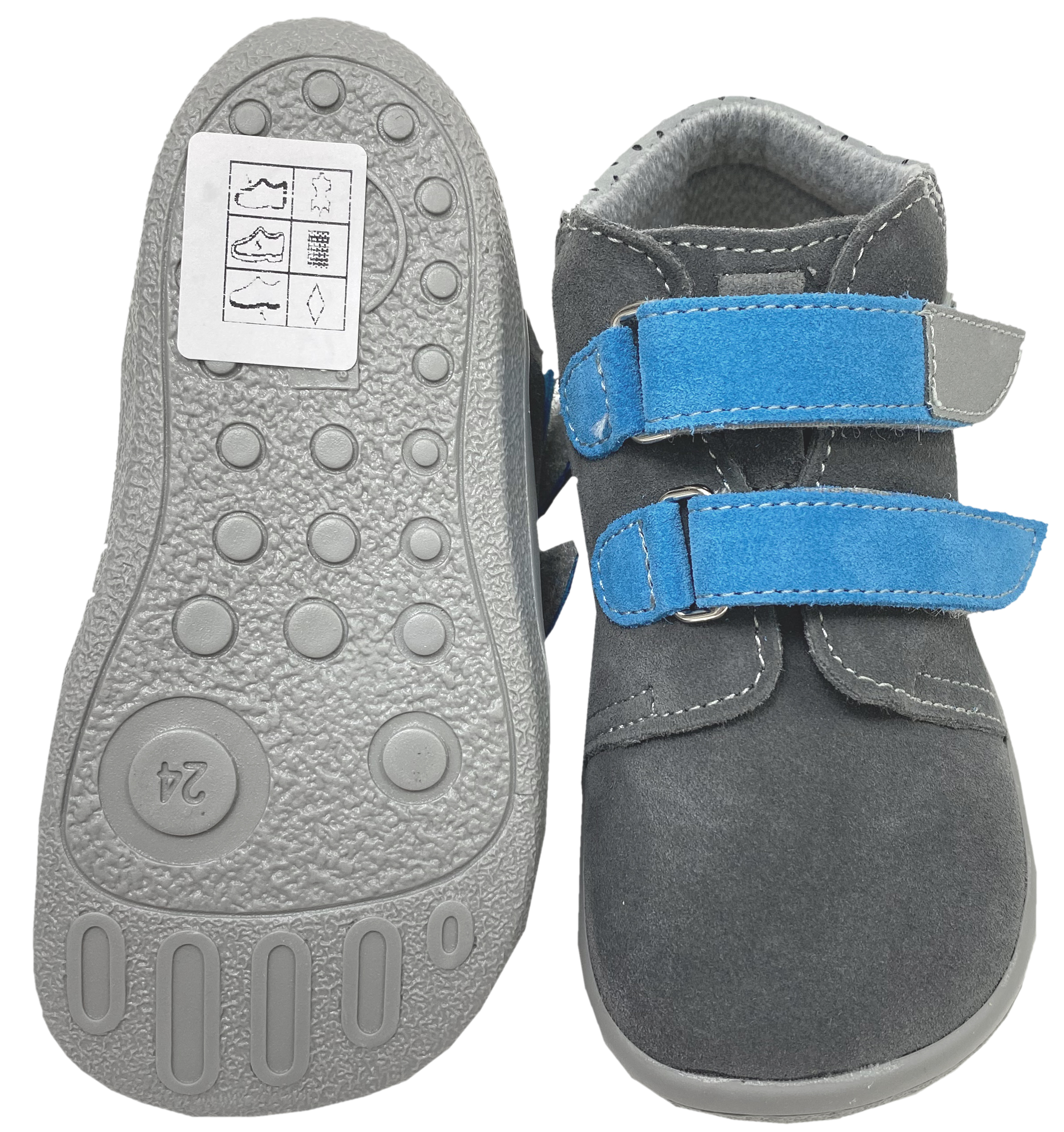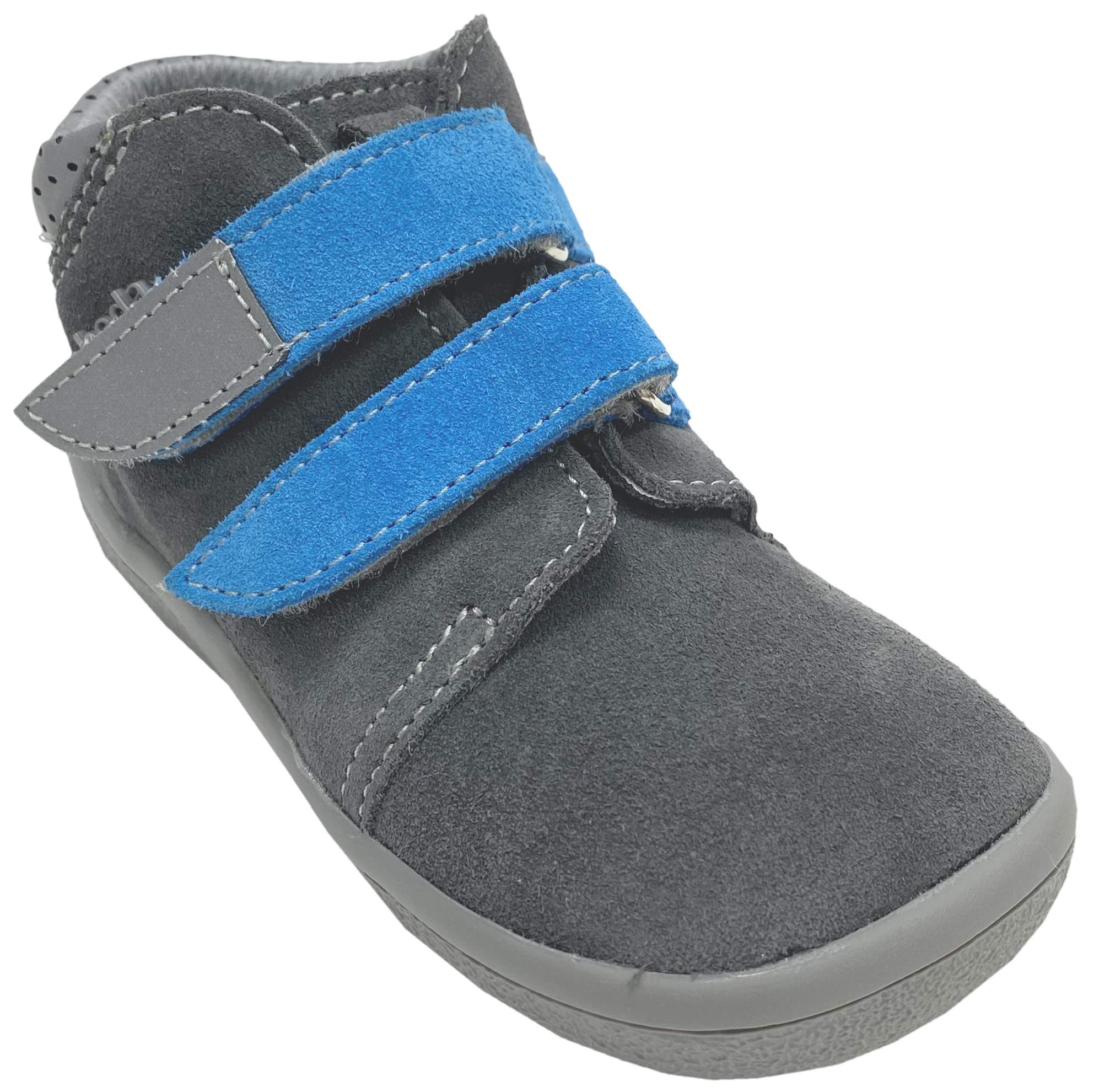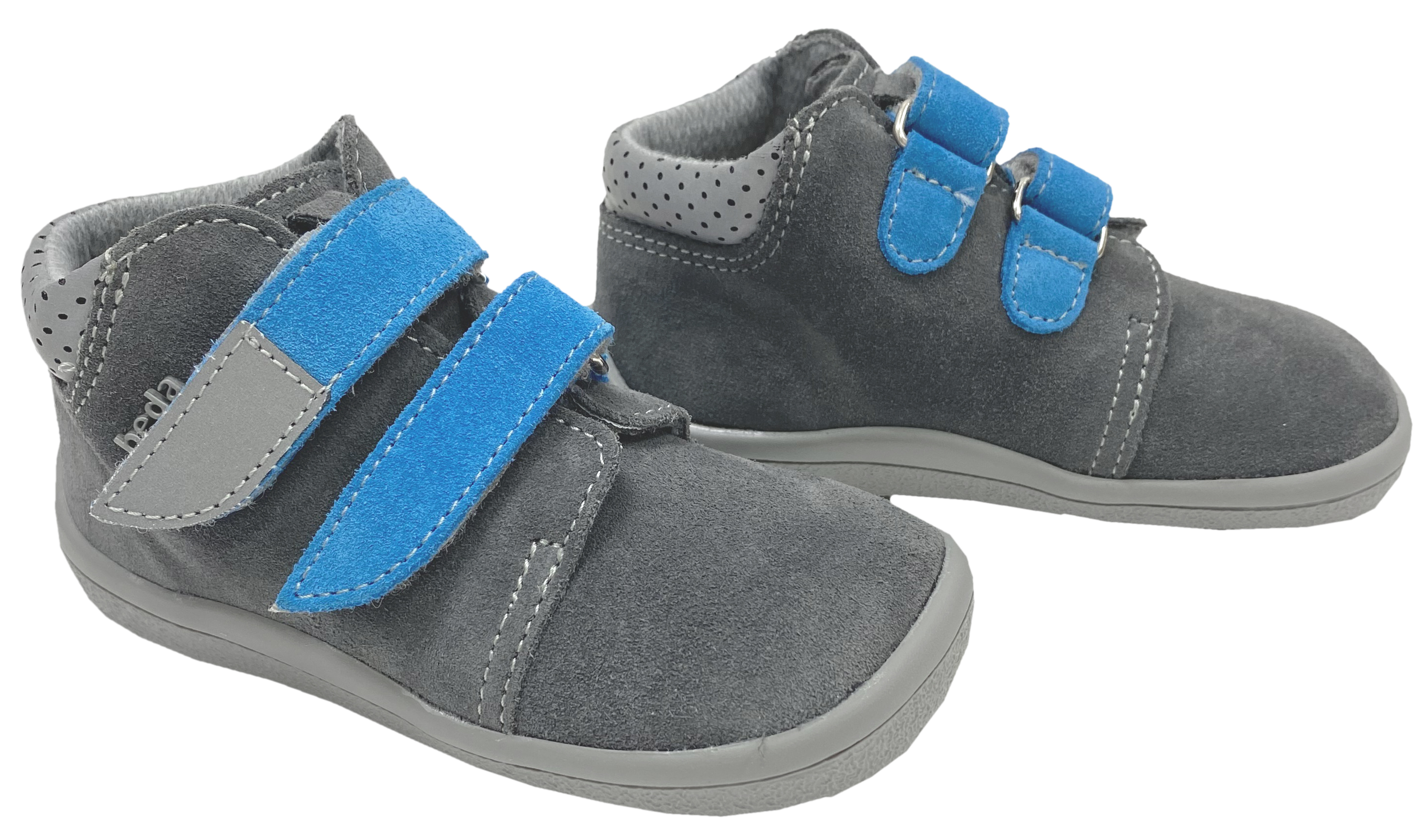 Robuste Barfußschuhe / Halbschuhe aus weichem Nubukleder mit reflektierenden Einsätzen am Klett und der Ferse, mit einer stark wasserabweisenden TEX Membran - TE POR - gearbeitet, V2 Linie mit etwas schmalerer Ferse, für Kids von dem Tschechischem Hersteller BEDA.