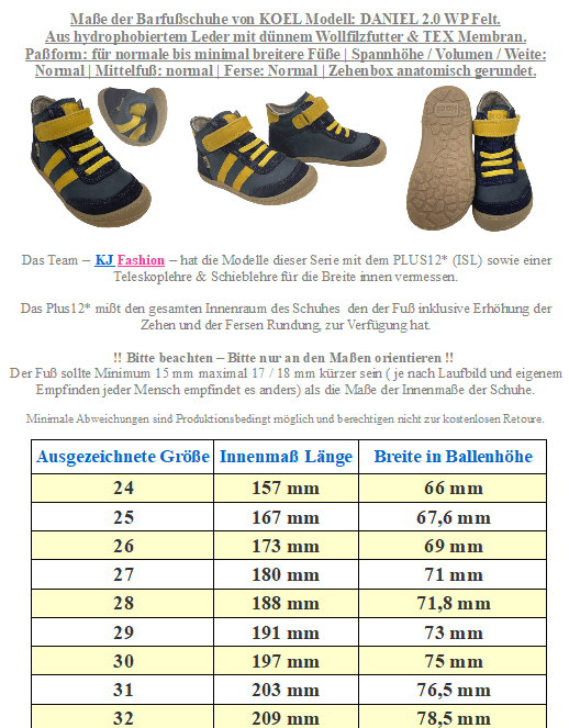 Lässig coole Barfußschuhe für den Übergang und milden Winter, aus hydrophobiertem Leder, darunter mit einer TEX Membran, innen mit warm haltendem, nicht zu dickem Wollfilz Futter, bis gut über den Gelenkknöchel gehend, flexibler Gummisohle ohne Sprengung oder Erhöhung in der Ferse.auf dem etwas breiteren Leisten ( verglichen mit den B / Klassik Modellen von KOEL ), mit normaler Spannhöhe ( Weite) optimal für Kids von KOEL Barefoot.