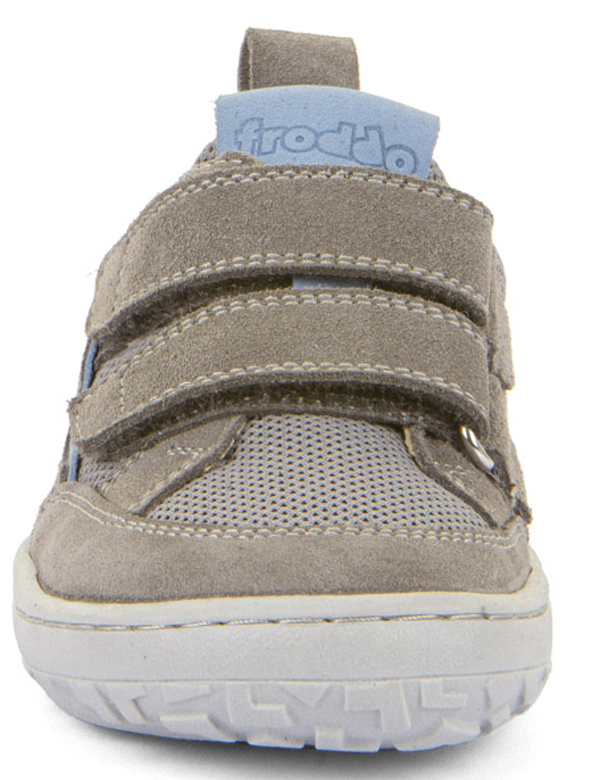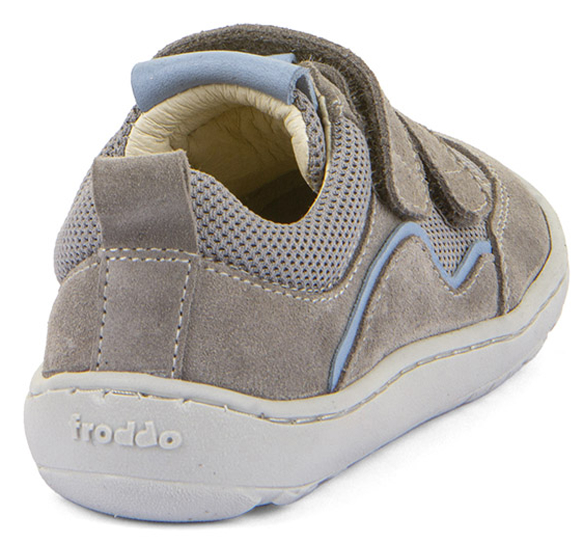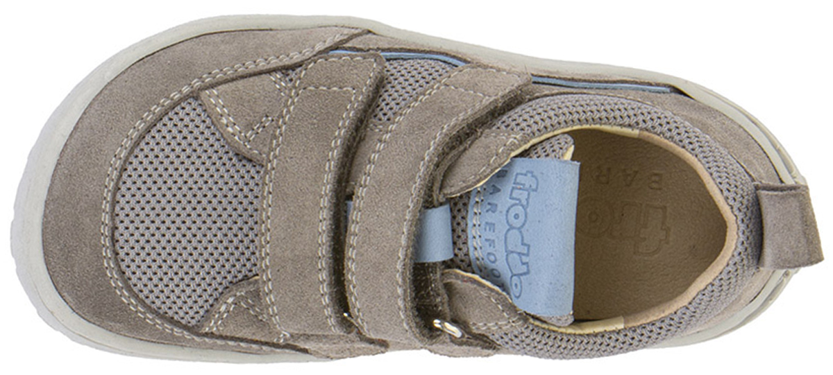Sportlich lässige Barfuß Sneaker mit quer und längs flexibler Minimalsohle / Grip Sohle, in klassischer Low Top Höhe mit Doppelklett über dem Mittelfuß, aus weichem Nubukleder mit Meshbesatz auf der neuen, noch weicheren, überarbeiteten Barefoot Grip Sohle von FRODDO aus Kroatien.