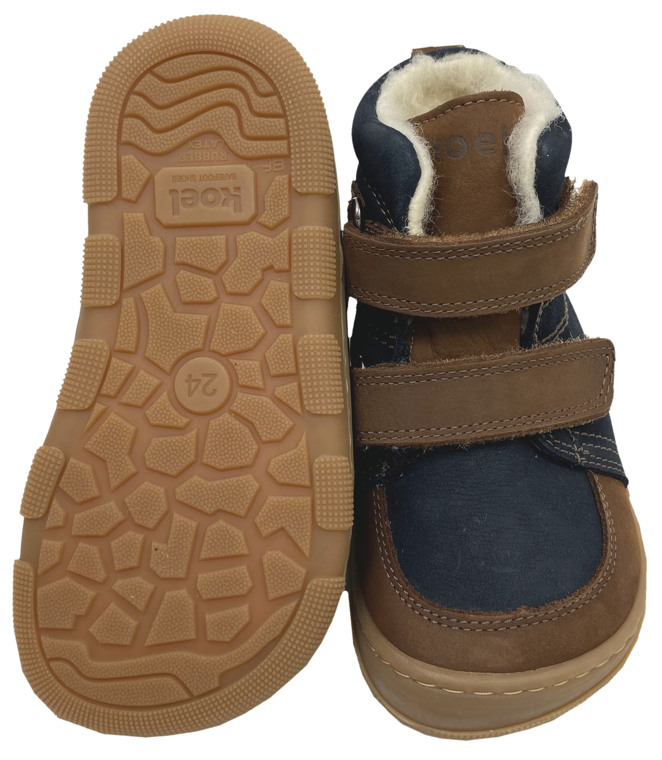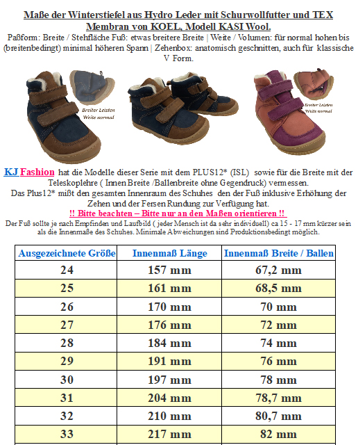 Robuste Barfußschuhe mit Tex Membran in halbhoher Form aus Leder mit Doppelklett zu öffnen, innen mit warm haltendem, nicht zu dickem Merino Wollfilz Futter gearbeitet, minimal quer und längs flexible Gummigrippsohle auf dem Extra breiten Leisten, mit etwas mehr Volumen im Spann Bereich ( Weite) von KOEL Barefoot. > Bitte beachten Sie die im Bild angegebenen Maße, um unnötige Rücksendungen zu vermeiden. Bei Fragen wenden Sie sich gerne vor dem Kauf per E-Mail an uns. Ihr Team KJ Fashion! < Modell: KALI Suede 15T007.125 - 170 Jeans / BlauMaterial: verschiedene echt Leder - stark Wasserabweisend dank Tex Membran zwischen den beiden Schichten | Innen: Merinowolle gefilzt | Sohle: GummiWeite ( diese bezieht sich auf das Volumen ) für einen mittleren bis höheren Spann geeignet | Leisten -Breite (Stehfläche Fuß) normal bis breit | Mittelfuß: etwas breiter | Ferse: normal bis etwas breiter | Zehenbox: anatomisch gerundet geformt - Barfußschuhe für kühlere Tage, in halbhoher Form bis über den Gelenkknöchel hinaus gehend - abgepolsterter Einstieg, innen mit weichem nicht zu dickem Wollfilz ausgelegt, zwischen den beiden Materialien mit einer Tex Membran gearbeitet ( Bitte beachten das Tex Membran nur funktionieren wenn es außen kälter als im Schuh ist, und diese GUT durchtrocknen kann ) - mit zwei breiten Klettstreifen zu öffnen, optimal an den Fuß anzupassen - herausnehmbare, mit Wollfilz bezogene Innensohle - flexible Gummisohle mit gutem Gripp Profil, durch das Futter sowie die TEX Membran ist die Sohle weniger knautschig weich als Modelle ohne Futter und ohne Tex - an der Spitze im Zehenbereich ist die Sohle hochgezogen als Schutzkante Der optimale Schuh für den milden Winter und den Übergang von KOEL Barefoot. !! Bitte beachten - für extreme Nutzung durch Bobby Car / Laufrad / krabbeln mit der Spitze etc bitte geeeignete Schutzkappen über die Schuhe ziehen - da diese dafür nicht ausgelegt sind !! !! TIP bei kalten Füßen - tragen sie am besten Socken die nicht zu eng am Fuß sitzen aus Wolle, da diese sich am Fuß des Kindes nicht so schnell feucht und sich damit kalt anfühlen wie eine Socke aus Baumwolle - auch Funktionssocken leiten die Feuchtigkeit des Fußes hervorragend ab, so das das Kind nicht so schnell kalte Füße durch feuchte Socken bekommt -> Hier geht es zu unseren Woll und Funktionssocken <