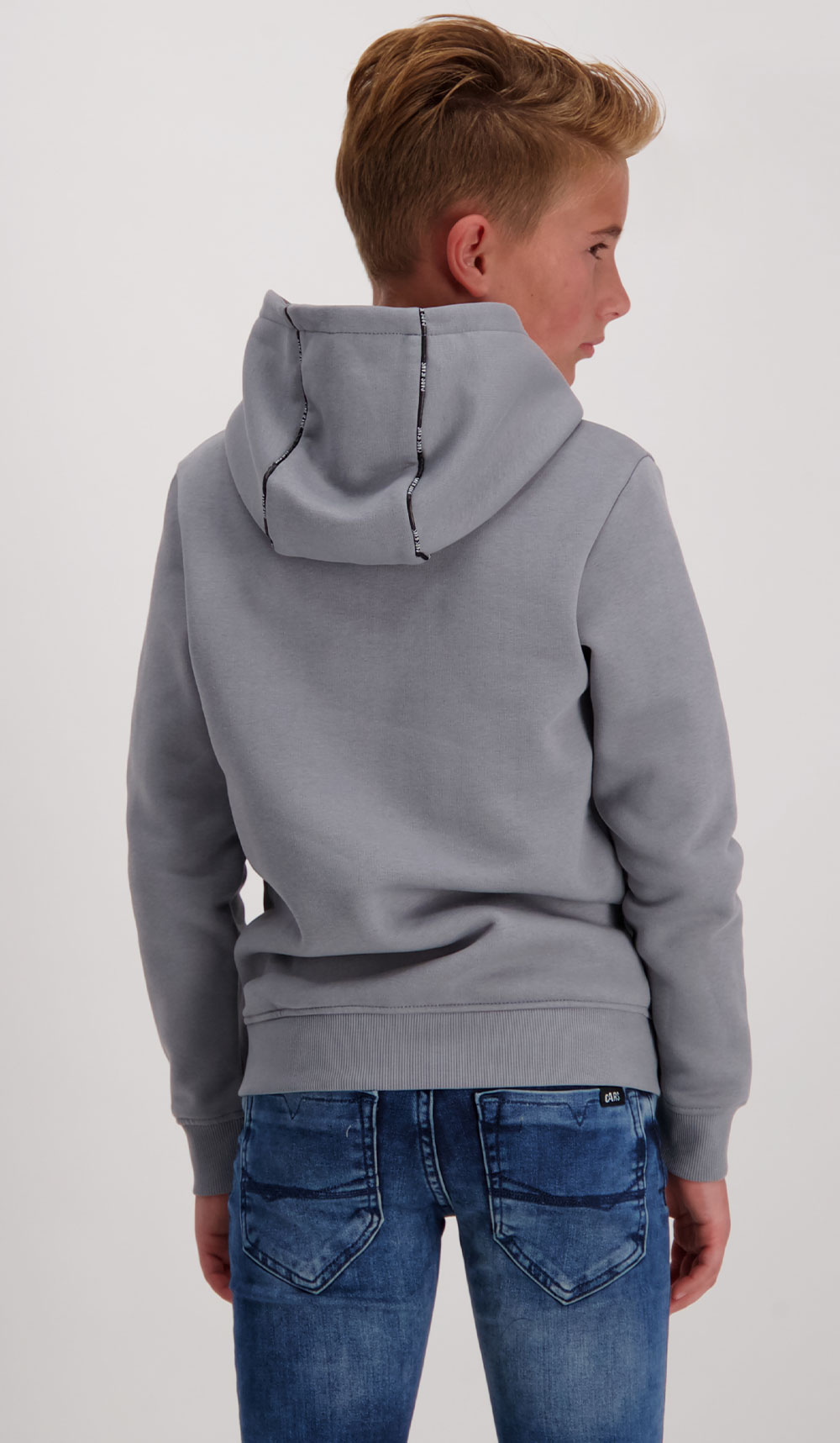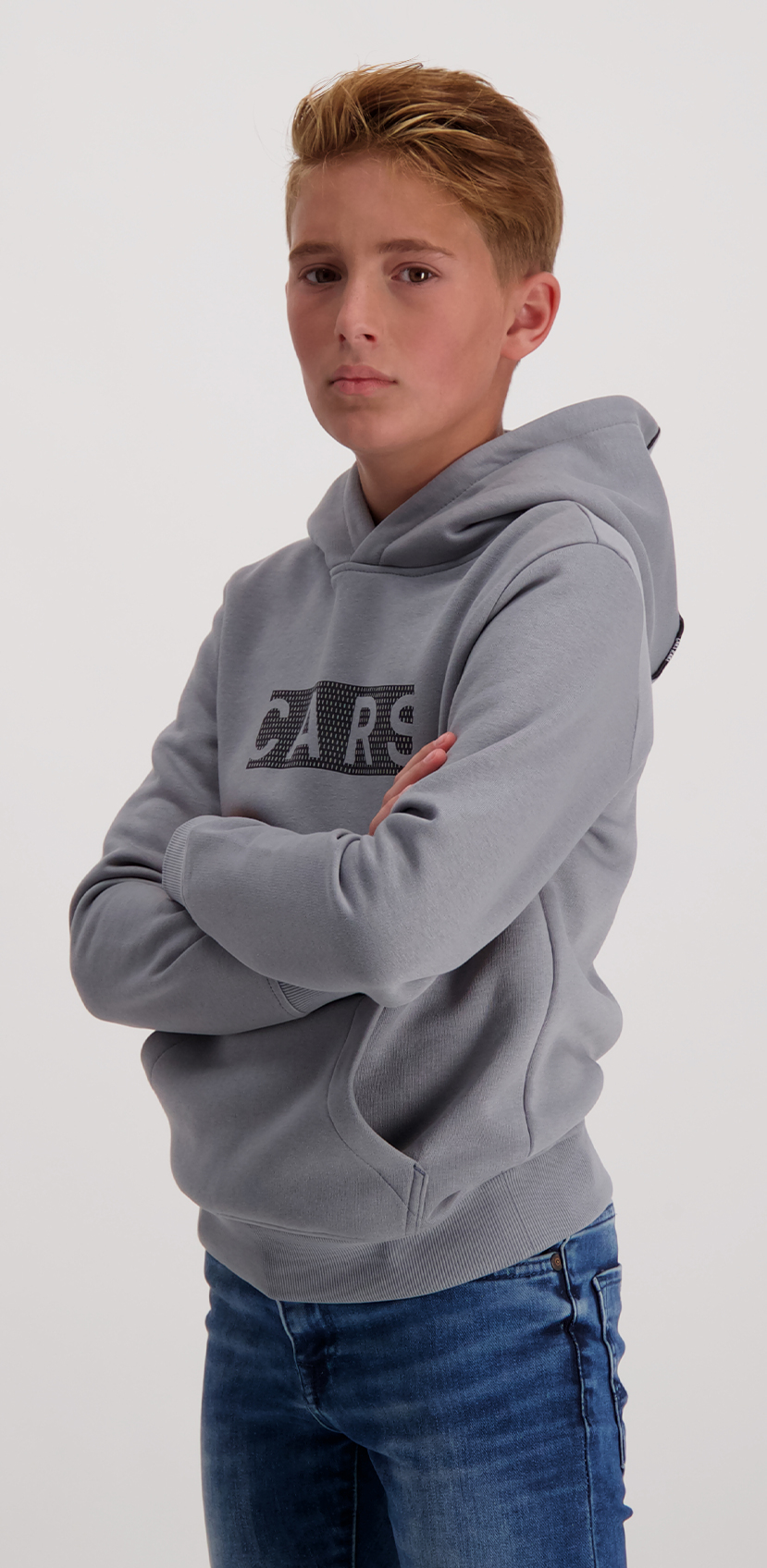 Kuschelig weicher Sweater in einem matten Grau / Blau Ton mit Kapuze und aufgesetzter Bauchtasche, Logo Print mittig, für den lässig sportlichen Look für Jungen von dem Denim & Fashion Label CARS JEANS aus den Niederlanden.