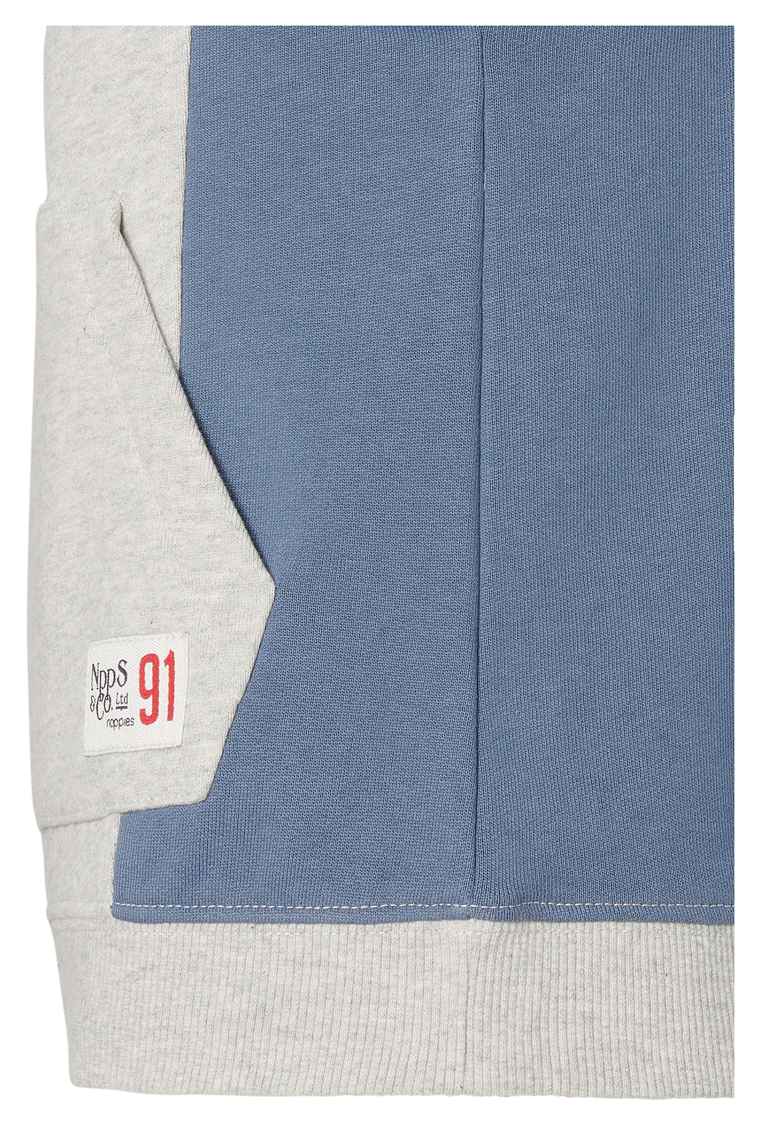 Sportlich lässiger Hoodie / Kapuzensweater in einem hellen Grau Melange Ton mit seitlichen Einsätzen in dunklem Navy Blau und einem gedeckten Jeansblau, mit großer Eingrifftasche auf dem Bauch, von dem Niederländischem Baby- , Kinder- und Schwangerschafts Label NOPPIES.