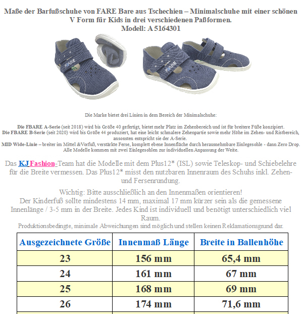 Luftige, leichte Halbsandalen / Barfusandalen von FARE BARE aus Tschechien – ideal für warme Tage, mit quer- und längsflexibler Gummisohle, weichem Leder-Obermaterial, angenehmem Mikrofaser-Innenfutter und schützendem Zehenbereich. Zwei Klettverschlüsse ermöglichen eine optimale Anpassung an den Kinderfuß. > Bitte beachten Sie die im Bild angegebenen Maße, um unnötige Rücksendungen zu vermeiden. Bei Fragen wenden Sie sich gerne vor dem Kauf per E-Mail an uns. Ihr Team KJ Fashion! < Modell: B 5461181Material Obermaterial: Leder | Innen: Mikrofaser / Textil | Sohle: Gummimischung Weite (diese bezieht sich auf das Volumen im Schuh) für normal hohen bis etwas höheren Spann geeignet da regulierbar | Breite des Leisten (Stehfläche Fuß) normal | Mittelfuß: normal | Ferse: normal | Zehenbox: anatomisch gerundet geformt - Leichte Halbsandale in Low-Top-Höhe (unter dem Knöchel) - innen leicht gepolsterte Ferse für zusätzlichen Komfort - Innenfutter aus weichem Textil/ Mikrofaser für angenehmes Fußklima - Zwei Klettverschlüsse zur individuellen Anpassung an den Mittelfuß / Weite und der Fessel - Herausnehmbare, seitlich hochgezogene Innensohle, dadurch rutschfest im Schuh - Quer und längs flexible Gummisohle mit Minimalprofil für gute Bewegungsfreiheit - Geschlossener Zehenbereich mit hochgezogener Sohle als Schutzkante Der optimale Schuh für die wärmeren Tage für aktive Kids die einen eher V förmigen Fuß haben. !! Bitte beachten - für extreme Nutzung durch Bobby Car / Laufrad etc bitte geeeignete Schutzkappen über die Schuhe ziehen - da diese dafür nicht ausgelegt sind !!