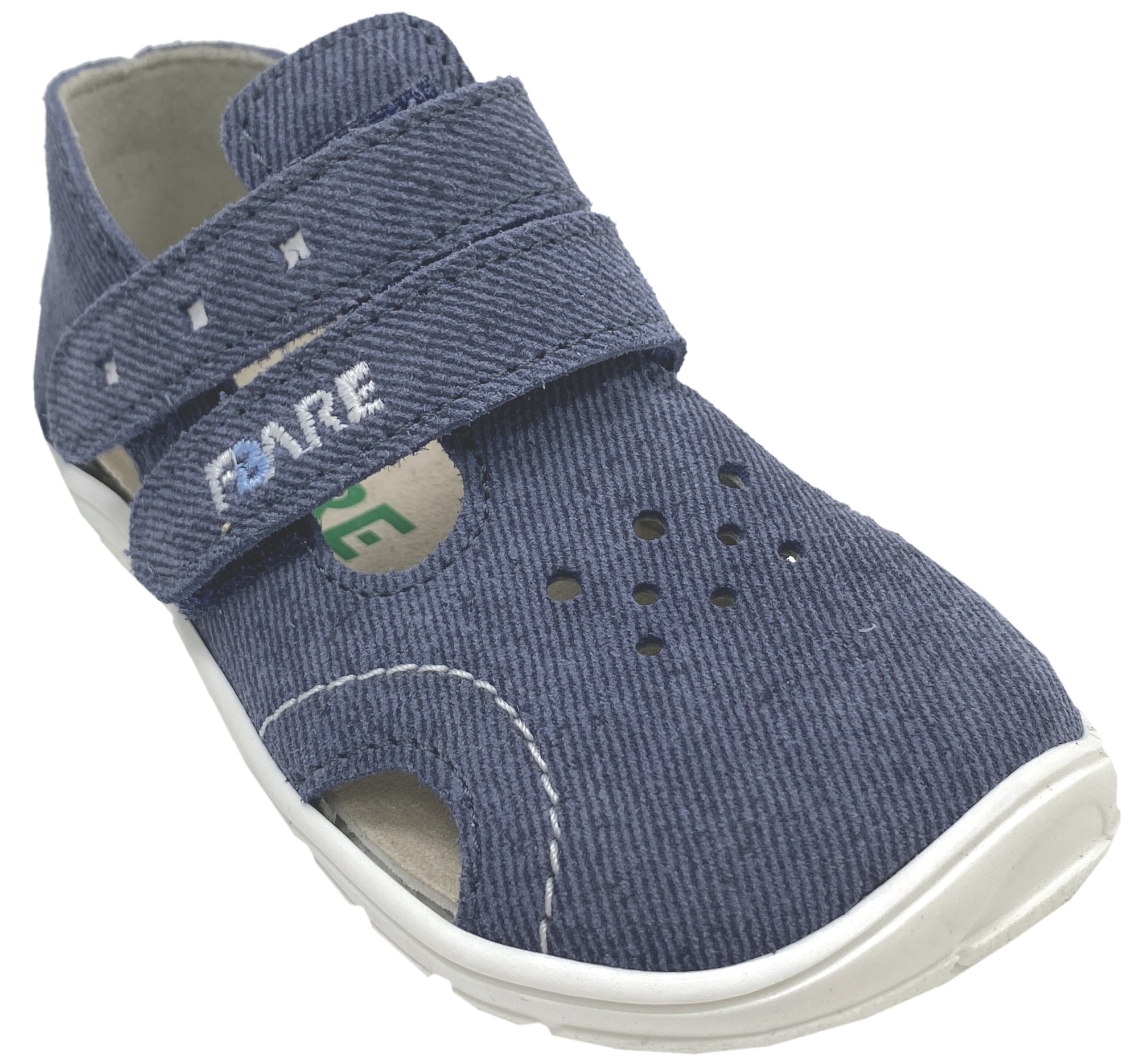 Luftige, leichte Halbsandalen / Barfusandalen von FARE BARE aus Tschechien – ideal für warme Tage, mit quer- und längsflexibler Gummisohle, weichem Leder-Obermaterial mit textiler Haptik, angenehmem Mikrofaser-Innenfutter und schützendem Zehenbereich. Zwei Klettverschlüsse ermöglichen eine optimale Anpassung an den Kinderfuß.