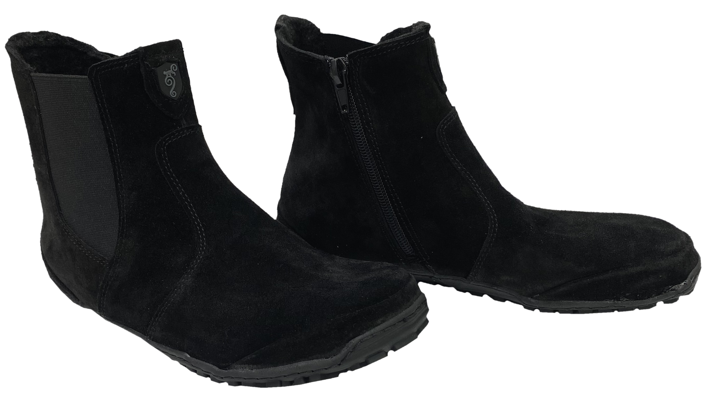 Schlichte gefütterte Barfußschuhe für kalte Tage in halbhoher Stiefel Form mit warm haltendem Schafswollfutter aus hydrophobiertem Nubukleder von SHAPEN Barefoot aus der Slowakai, hergestellt in der Europäischen Union. > Bitte beachten Sie das Maßbild und unsere Passform-Hinweise, um Rücksendungen zu vermeiden. Bei Fragen kontaktieren Sie uns gerne vor dem Kauf per Mail. – Ihr Team KJ Fashion < Modell: COZY 2.0 Nubuck BlackMaterial: Hydrophobiertes Nubukleder | Futter: Schafswolle , Innensohle fest verklebt aus Schafswolle | Sohle: robustes SBR Gummi, sehr gut quer und längs flexibel mit einer Stärke von 4 mm + 4 mm ProfilPaßform: Weite (diese bezieht sich auf das Volumen): für normal hohen bis minimal höheren Spann geeignet | Breite (Stehfläche Fuß) Normal bis etwas breiter, gerade im Vorfuß | Ferse: normal | Zehenbox: sehr gut anatomische Form, für dominanten Großzeh geeignet - Winterschuhe bis gut über den Gelenkknöchel gehend, bis etwa zur Mitte der Wade - gut sitzender Schaftabschluß, variierbar durch die Schnürung - seitlich mit einem Reißverschluß zu öffnen - innen mit einem kuschelig weichen Wollfutter ausgelegt, auch die Innensohle ist abgefüttert - Vorfußbereich angenehm weit und breit geschnitten zum optimalen auffächern der Zehen beim laufen - Laufsohle aus Styrol-Butadien Kautschuk, sehr robust aber dennoch quer und längs flexibel, fest vernäht für eine lange Lebensdauer, mit 4 mm Profil für einen guten Grip Ein super bequemer, warm gefütterter Barfußschuh ohne jegliche Erhöhungen, absolut weich und hergestellt in der EU - von SHAPEN Barefoot.
