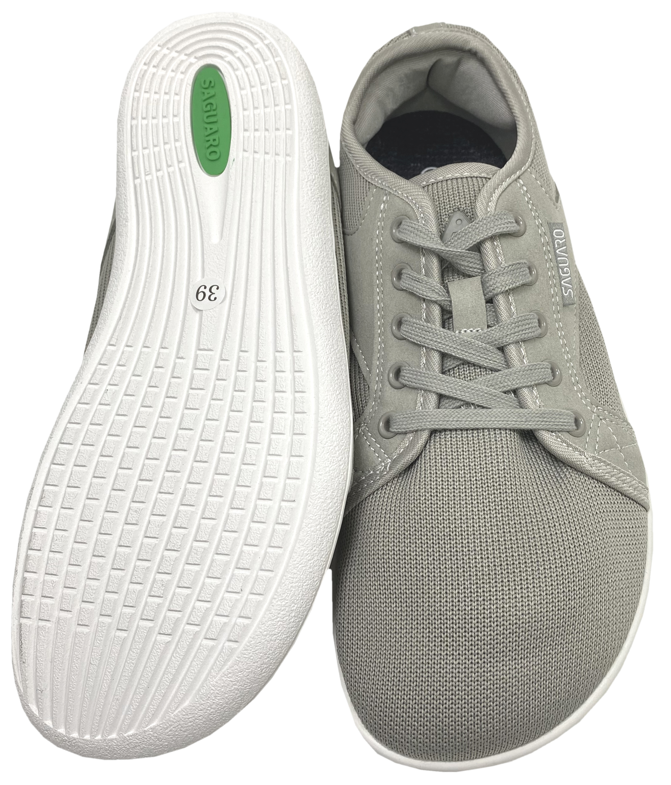 Super leichte Schuhe ( Gr.39 dieses Modelles hat ein Gewicht pro Paar von 450 Gramm) aus luftigem Strickgewebe / Mesh mit breiten Flachsenkeln in Schuhfarbe und 4 mm dünner Laufsohle aus flexiblem Gummi mit gutem Grip Profil von SAGUARO.