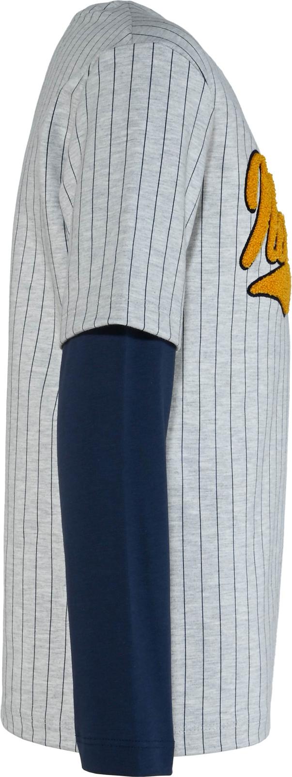 Lässig cooler Sweater im Football Style, im Lagenlook, in einem hellen Grau Melange mit schmalen Blauen Streifen und großem New York Frottee Patch in Gelb, weiches Sweat, innen kuschelig, mit langen Ärmeln im Lagenlook in Navy Blau aus leichter Jersey Ware, für Jungen von dem Trend Denim Label BLUE EFFECT.