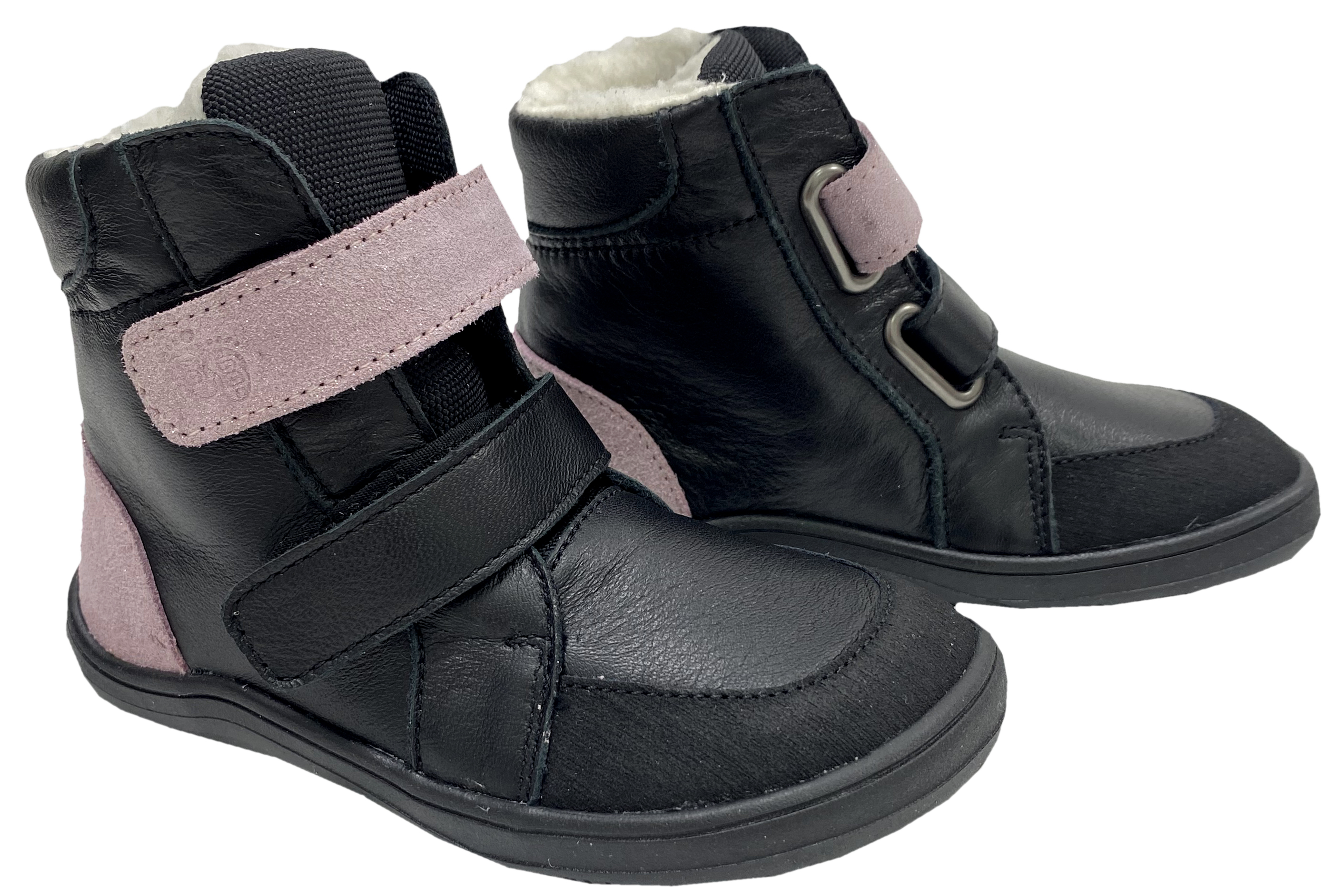 Super leichte und bequeme Stiefel aus weichem Leder mit kuscheligem, textilen Kunstfellfutter, dazwischen mit der Tex Membran gearbeitet, mit Doppelklett zu schließen (ab Gr. 34 mit 3 Klettstreifen), aus der Zentralslowakai von BABY BARE - ein kleiner Produzent von Barfußschuhen mit Minimalsohlen für Kinder.