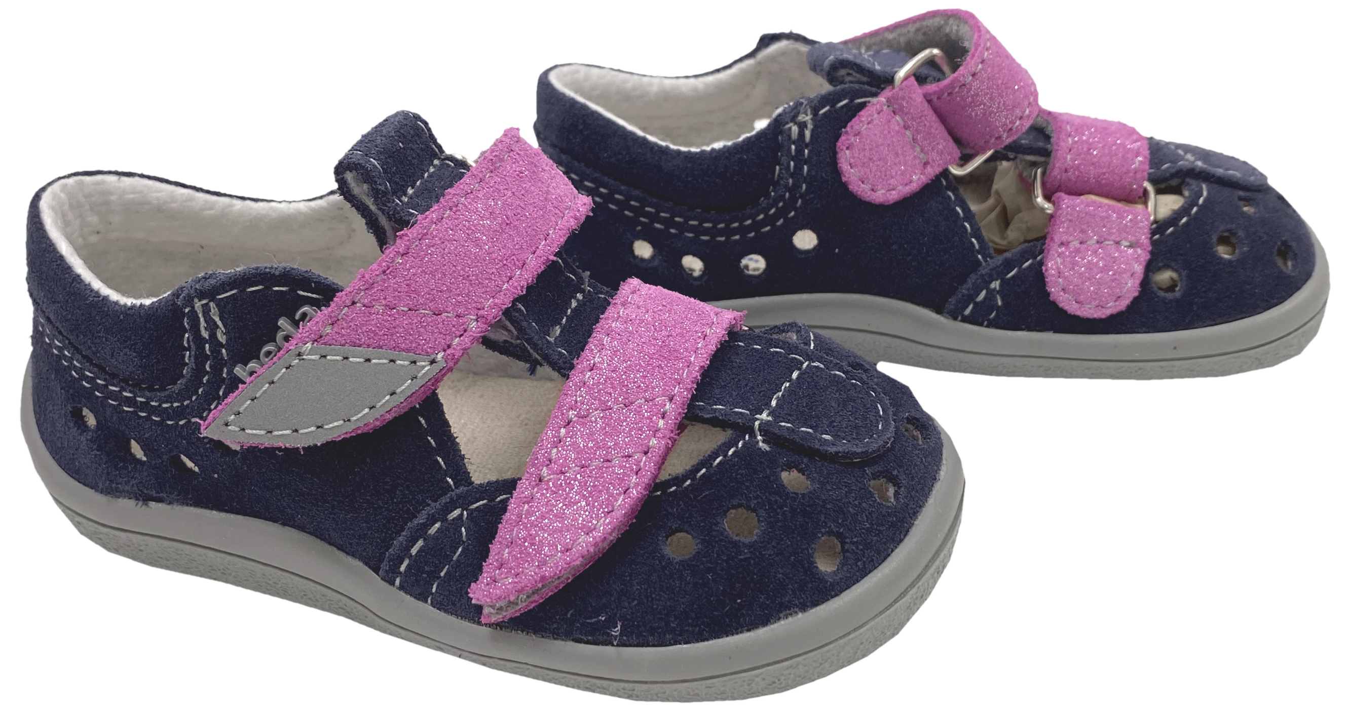 Ganz leichte Barfußschuhe / Halbsandalen für den Sommer aus weichem Nubukleder mit reflektierendem Patch am Klett, quer und längs flexible Minimalsohle, für Kids mit etwas kräftigeren Füßen von dem Tschechischen Hersteller BEDA.