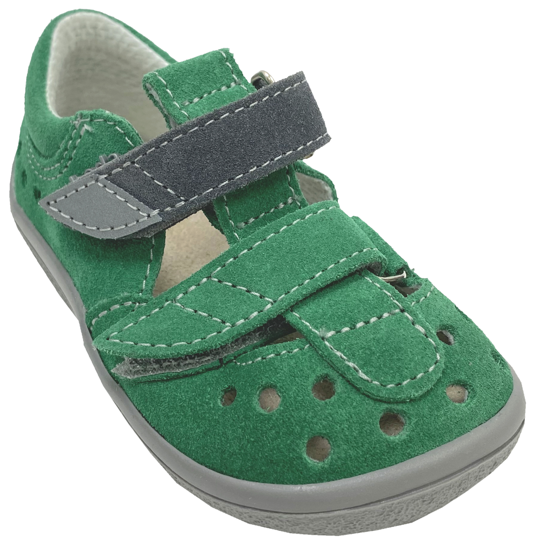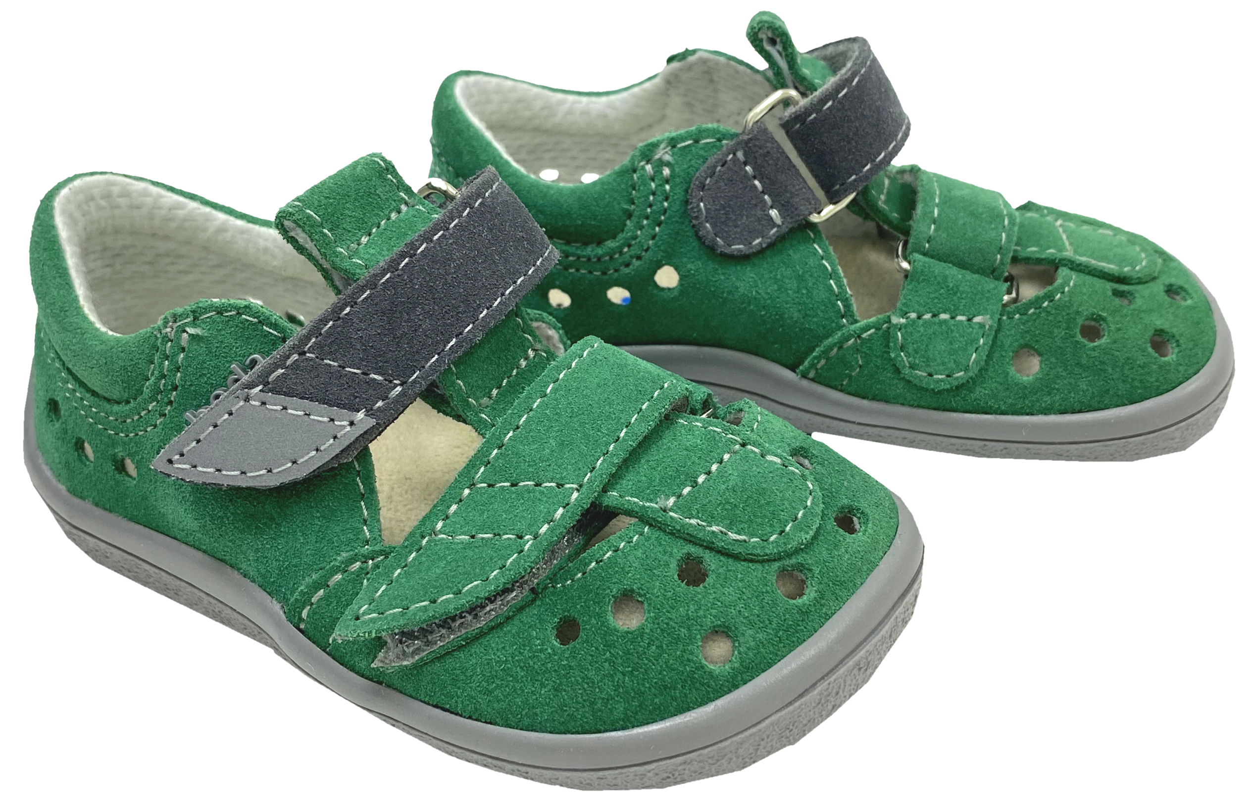 Ganz leichte Barfußschuhe / Halbsandalen für den Sommer aus weichem Nubukleder mit reflektierendem Patch am Klett, quer und längs flexible Minimalsohle, für Kids mit etwas kräftigeren Füßen von dem Tschechischen Hersteller BEDA.