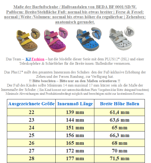 Ganz leichte Barfußschuhe / Halbsandalen für den Sommer aus weichem Nubukleder mit reflektierendem Patch am Klett, quer und längs flexible Minimalsohle, für Kids mit etwas kräftigeren Füßen von dem Tschechischen Hersteller BEDA. > Bitte beachten Sie die im Bild angegebenen Maße, um unnötige Rücksendungen zu vermeiden. Bei Fragen wenden Sie sich gerne vor dem Kauf per E-Mail an uns. Ihr Team KJ Fashion! < Modell: BF 0001/SD/W Mateo in JeansblauMaterial: Nubukleder | Innen: Textil / Mesh Futter | Sohle: quer & längs flexible GummisohleWeite (diese bezieht sich auf das Volumen / Spannhöhe ) für normalen bis höheren Spann geeignet | Leisten / Breite (Stehfläche Fuß) Mittel bis etwas breiter | Mittelfuß: Normal bis etwas breiter | Ferse: normal | Zehenbox: gerundet, anatomische Form - Barfußschuhe für Kinder die etwas mehr Volumen benötigen - oben uns seitlich offener gearbeitet für eine gute Belüftung der Füße - klassische Halbsandalen Form für wärmere Tage, die aber dennoch Schutz wie ein Halbschuh bieten - mit zwei Klettstreifen zu öffnen und so auch sehr gut über den Mittelfuß anzupassen - herausnehmbare Innensohle mit dünnem Leder bezogen - robuste sehr gut quer und längs flexible Sohle ohne Erhöhungen / keine Mittelfußpolster oder versteckte Sprengungen, mit etwas Profil Ein prima Minimalschuh / Halbsandale für wärmere Tage von BEDA. !! Bitte probiert Schuhe aus hygienischen Gründen immer mit sauberen Söckchen an (Sporen und Schweiß haften so weniger bis gar nicht im Schuh) / Nicht geeignet zum Rutscheauto / Laufrad fahren, schleifen über dem Boden reibt die dünnen Sohlen kaputt !!