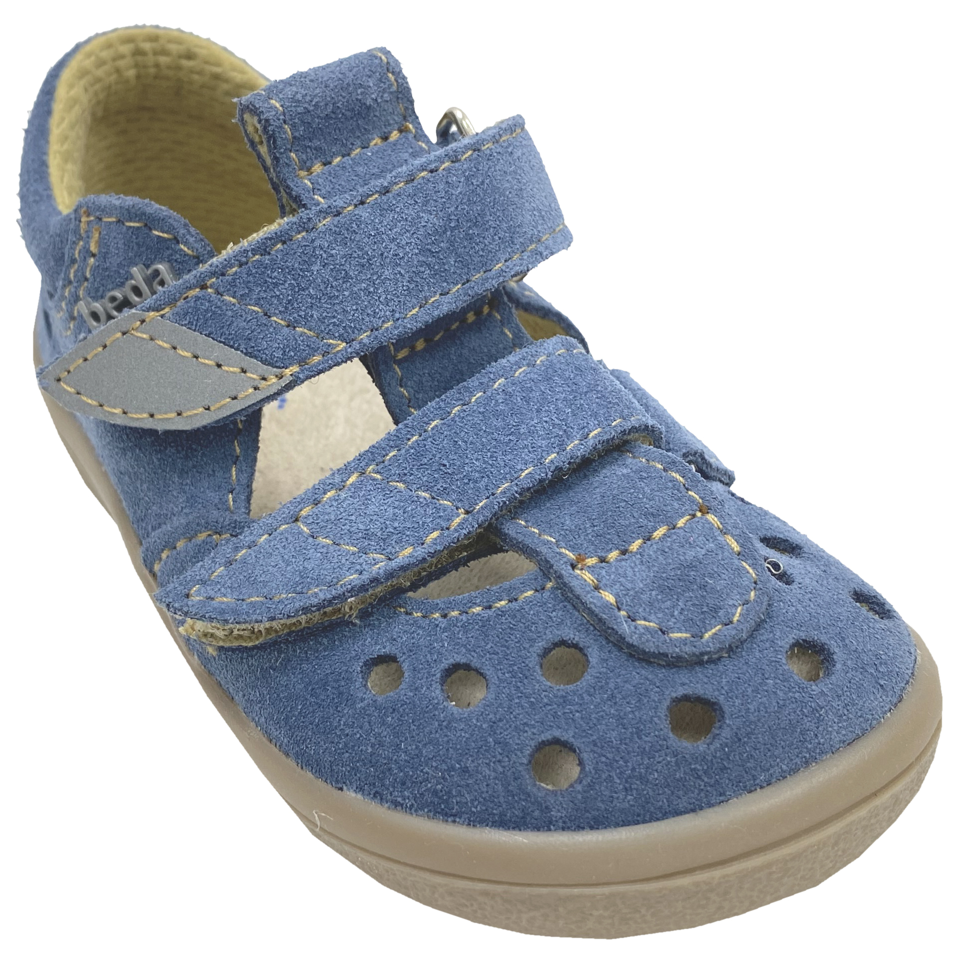 Ganz leichte Barfußschuhe / Halbsandalen für den Sommer aus weichem Nubukleder mit reflektierendem Patch am Klett, quer und längs flexible Minimalsohle, für Kids mit etwas kräftigeren Füßen von dem Tschechischen Hersteller BEDA.