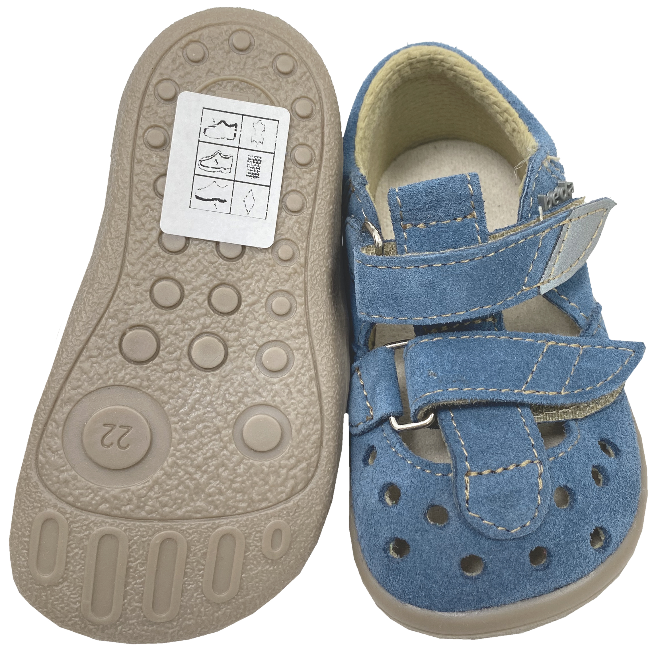 Ganz leichte Barfußschuhe / Halbsandalen für den Sommer aus weichem Nubukleder mit reflektierendem Patch am Klett, quer und längs flexible Minimalsohle, für Kids mit etwas kräftigeren Füßen von dem Tschechischen Hersteller BEDA. > Bitte beachten Sie die im Bild angegebenen Maße, um unnötige Rücksendungen zu vermeiden. Bei Fragen wenden Sie sich gerne vor dem Kauf per E-Mail an uns. Ihr Team KJ Fashion! < Modell: BF 0001/SD/W Lucas in dunklem Navy BlauMaterial: Nubukleder | Innen: Textil / Mesh Futter | Sohle: quer & längs flexible GummisohleWeite (diese bezieht sich auf das Volumen / Spannhöhe ) für normalen bis höheren Spann geeignet | Leisten / Breite (Stehfläche Fuß) Mittel bis etwas breiter | Mittelfuß: Normal bis etwas breiter | Ferse: normal | Zehenbox: gerundet, anatomische Form - Barfußschuhe für Kinder die etwas mehr Volumen benötigen - oben uns seitlich offener gearbeitet für eine gute Belüftung der Füße - klassische Halbsandalen Form für wärmere Tage, die aber dennoch Schutz wie ein Halbschuh bieten - mit zwei Klettstreifen zu öffnen und so auch sehr gut über den Mittelfuß anzupassen - herausnehmbare Innensohle mit dünnem Leder bezogen - robuste sehr gut quer und längs flexible Sohle ohne Erhöhungen / keine Mittelfußpolster oder versteckte Sprengungen, mit etwas Profil Ein prima Minimalschuh / Halbsandale für wärmere Tage von BEDA. !! Bitte probiert Schuhe aus hygienischen Gründen immer mit sauberen Söckchen an (Sporen und Schweiß haften so weniger bis gar nicht im Schuh) / Nicht geeignet zum Rutscheauto / Laufrad fahren, schleifen über dem Boden reibt die dünnen Sohlen kaputt !!