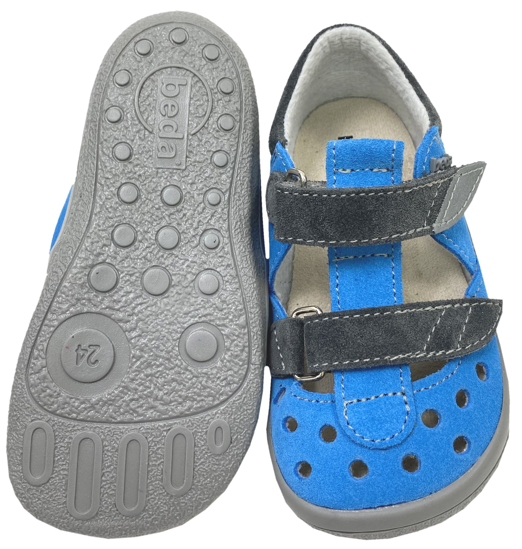 Ganz leichte Barfußschuhe / Halbsandalen für den Sommer aus weichem Nubukleder mit reflektierendem Patch am Klett, quer und längs flexible Minimalsohle, für Kids mit etwas kräftigeren Füßen von dem Tschechischen Hersteller BEDA.