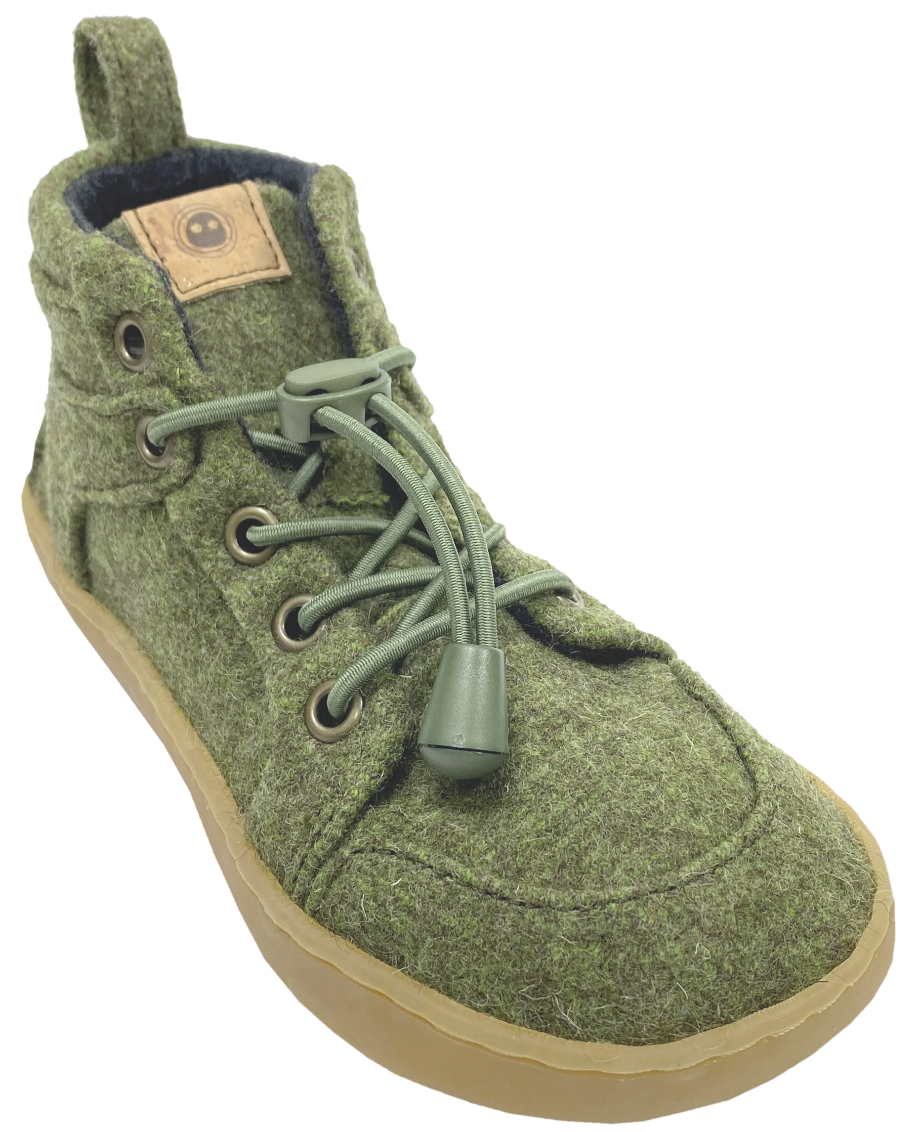 Schicke Barfußschuhe in trendiger High Top Höhe mit Ultra flexibler Minimalsohle aus 2,5 mm Naturkautschuk, robustem Wollwalk und innen mit weichem Wollwalk im Fischgrätmuster, in gedecktem Olive Grün mit Elastiksenkel von MUKISHOES, handgefertigt und fair produziert in Portugal.