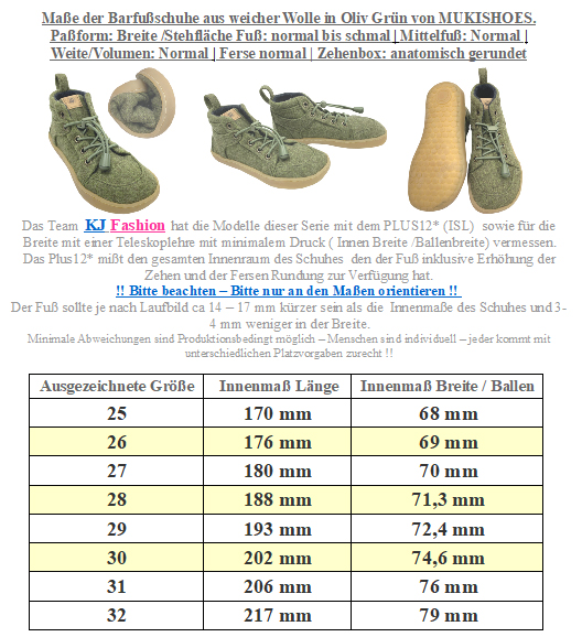Sportlich stylische, vegane Barfußschuhe in trendiger Form - super leicht, weich und extrem flexibel. Das sind diese High Top Sneaker aus robuster Bio Baumwolle in Canvas Qualität mit Elastiksenkeln und Schnellverschluß, in mattem Grün mit super weicher, flexibler 2,5 mm Naturkautschuksohle von MUKISHOES Kids, handgefertig und Fair produziert in Portugal. !! KJ FASHION Tip: Bitte dringend das Bild mit den genauen Innensohlenmaßen je Größe beachten - Breite wird mit Druck ( Clevermess siehe Tabelle Beschr. gemessen) !! Bei Fragen gerne Mail an uns :-) Modell: Challenge Kids in matt Gelb / Grün Material VEGAN, Obermaterial : weich gefärbte Bio-Baumwolle in grün / blau | Futter: Bio-Baumwolle in hell lila | Sohle: 2,5 mm starker Naturkautschuk in pastellgelb | Schnürsenkel : elastischer Gummi, umwickelt mit Bio-BaumwollschnurPaßform: Leiste (Standfläche Fuß - als Breite bezeichnet ) Mittel | Weite ( beschreibt das Volumen auch als Spannhöhe bezeichnet) : normal & variierbar | Mittelfuß: normal | Ferse: normal | Zehenbox: Anatomisch geformt, nicht für sehr dominanten Großzeh - weiche BIO Baumwolle in grober Canvas Qualität dicht gewebt, bis knapp über den Knöchel gehend - Mid Top Höhe - derbe Ösen für gute Haltbarkeit, kindgerechter Schnellverschluß mit gut dehnbaren Elastiksenkeln zum regulieren der Spannhöhe - schlichte Optik aber nicht langweilig durch gesetzte Ziernähte und Ton in Ton gehaltene Einsätze - Ferse innen weich abgepolstert, innen mit weicher Bio Baumwolle ausgelegt - fest vernähte Innensohle um ein verrutschen zu vermeiden - extrem weiche, flexible 2,5 mm Gummisohle mit leichtem Noppenprofil !! Bitte bei empfindlichen Füßen mit Söckchen tragen um zu starke Reibung an der ungeschützten Haut zu vermeiden - beim probieren bitte IMMER mit Socken!! Ein richtig sportlich schicker Sneaker mit extrem geringen Gewicht und einfach super weich und biegsam von MUKISHOES. Durch die extra weichen und leichten Materialien der Schuhe ( das besondere an dem Schuh ) bitte beachten das dies nicht zum Laufrad fahren, Bobby Car fahren , generell das starke schleifen des Materials auf Asphalt / Steinen etc. geeignet sind - da dieses das Material extrem beansprucht und es zu Rissen etc kommen kann.