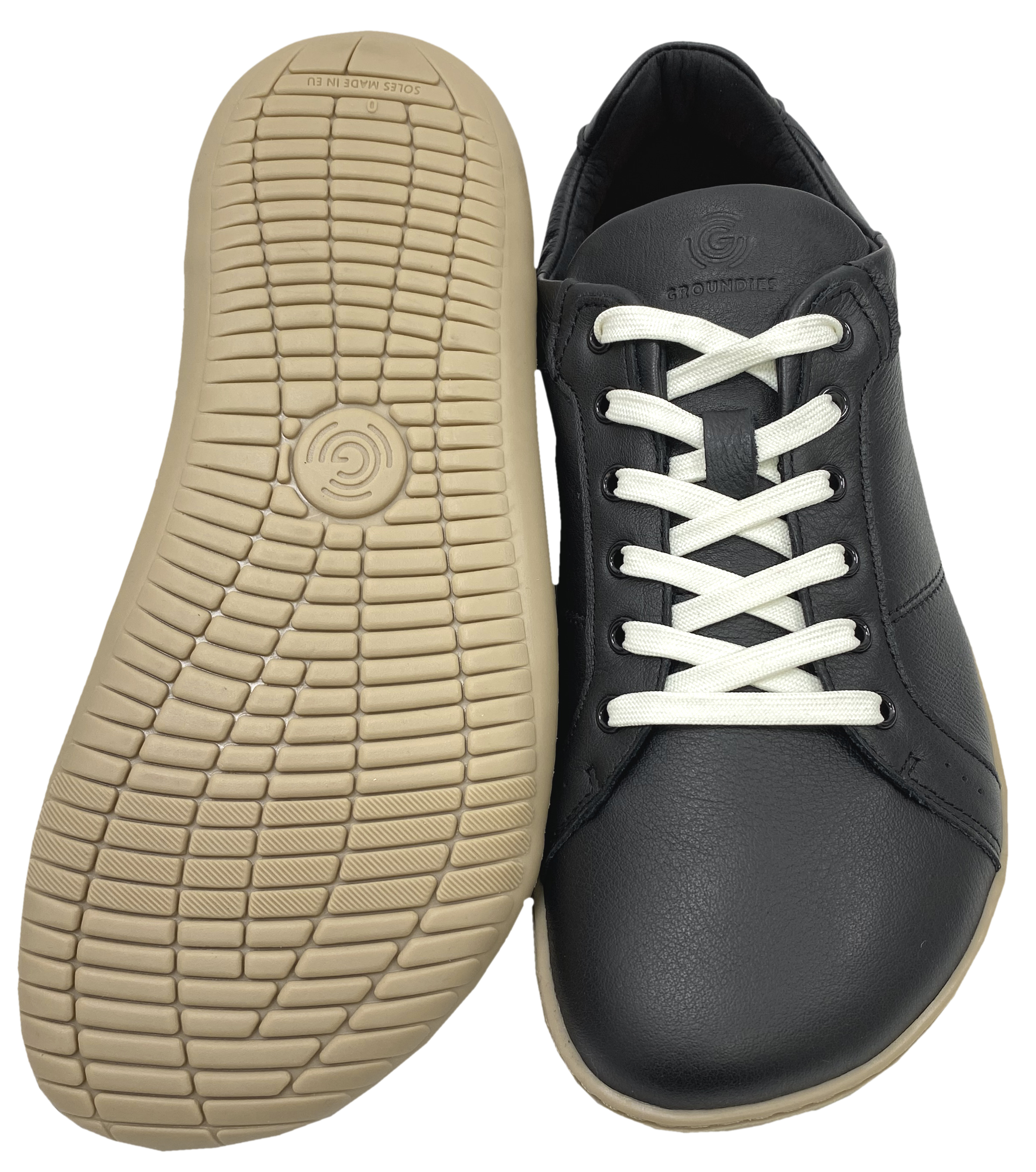 Klassisch schicke Barfußschuhe in schlichtem Schwarz mit Beiger Sohle, aus weichem, hochwertigem Glattleder mit extra breiter Zehenbox auf einem etwas breiteren Leisten ( Wide+ Serie) super flexibler, weicher GO1 Sohle komplett neutralem Fußbett ohne jegliche Erhöhungen von GROUNDIES.
