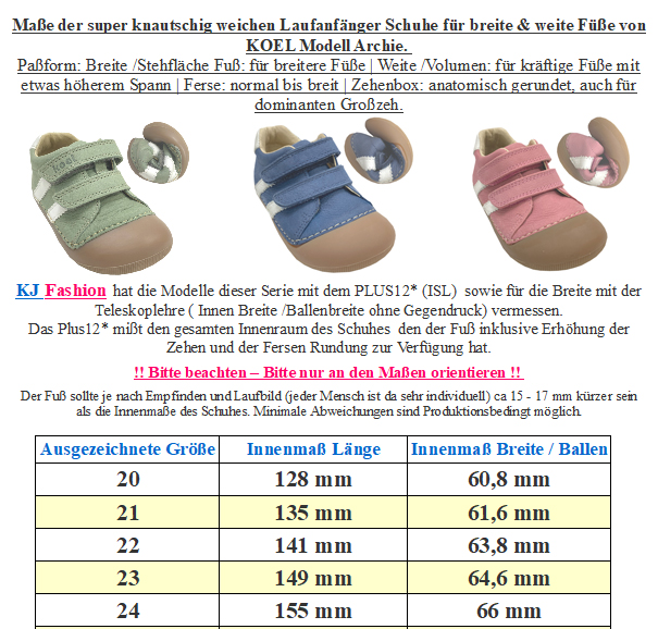 Super weiche und absolut flexible Barfußschuhe - Halbschuhe in minimal höherer Form, aus weichem hydrophobiertem Kalbsleder innen mit Glattleder ausgelegt, Innensohle herausnehmbar, auf dem breiten Leisten ( verglichen mit dem DON und auch D.. 2.0 Modellen von KOEL ) mit Klett anpassbarer Spannhöhe ( Weite) von KOEL Barefoot. !!Bitte beachten sie die als Bild hinterlegte Tabelle mit den genauen Maßen, um ein unnötiges hin und her senden zu vermeiden - bei Fragen mailen Sie uns einfach vor dem Kauf an - Ihr Team KJ Fashion !! Modell: Kami W 07W002.121- 360 Oliv, Salbei / Oliv Ton mit mattem Finish und Beiger Kontrastnaht gestepptMaterial: Nappaleder gebürstet und Hydrophobiert / sanft, mattes Finish | Innen: Glattleder | Sohle: GummiWeite (diese bezieht sich auf das Volumen im Schuh) W - für einen höheren Spann geeignet | Leiste (Stehfläche Fuß) breit | Mittelfuß: normal bis etwas breiter | Ferse: normal (proportional) | Zehenbox: anatomisch gerundet geformt - Halbschuh für breite Füße mit etwas höherem Spann / Volumen, in seitlich minimal höherer Form - abgepolsterter Einstieg, innen mit weichem Glattleder ausgelegt - mit zwei Klettstreifen zu öffnen, optimal an den Fuß anzupassen und so auch super im Umfang / der Spannhöhe zu regulieren - herausnehmbare, weiche, mit Leder bezogene Sohle - quer und längs flexible Gummisohle mit Minimalprofil, Nullabsatz und keinerlei Erhöhungen im Mittelfuß oder der Ferse - an der Spitze im Zehenbereich ist die Sohle etwas hochgezogen als Schutzkante - super weich und flexibel, das Material weicht sich noch mehr beim tragen der Schuhe Der optimale Schuh für den Übergang für Kinder von KOEL Barefoot.