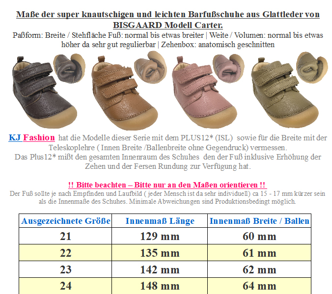 Der optimale Schuh für die Kleinen, die es nicht mehr erwarten können die Welt zu erobern - wenn es gar nicht mehr ohne Schuhe geht - dann sind die ganz leichten ( Gr. 20 hat ein Gewicht von ca 65 Gramm) Lederschühchen mit der 3,3 mm Magical Rubber Sohle die perfekte Wahl - schlichte Minimalschuhe aus weichem Leder mit einer rollbaren Sohle von MAGICAL SHOES. !!Bitte beachten sie die als Bild hinterlegte Tabelle mit den genauen Maßen der Schuhe, um so ein unnötiges hin und her senden zu vermeiden - bei Fragen mailen Sie uns einfach vor dem Kauf an - Ihr Team KJ Fashion !! Modell: Baloo 2.0 in Navy BlauMaterial: Premium Nappa Leder ( Rindsleder ) | Innen: die gerauhte Seite des Leders | Innensohle: mit Leder bezogen | Sohle: Gummi mit minimal Profil 3,3 mm, sehr gut rollbar, leicht quer flexibelWeite (diese bezieht sich auf das Volumen) M - W für normal hohen bis hohen Spann geeignet | Leiste (Stehfläche Fuß) Normal | Mittelfuß: normal | Ferse: normal | Zehenbox: anatomisch gerundet und hoch (viel Platz zum auffächern der Zehen) - etwas mehr als ein Lederpuschen / Krabbelschuh aber etwas weniger als ein klassischer "Lauflernschuh " - ganz weiches Nappaleder schützt den Fuß ohne ihn einzuengen, die dünne Sohle schützt vor Verletzungen ohne zu starr zu sein - der breite Klett geht sehr gut um den Fußrücken um den Schuh so optimal an den Fuß des Kindes anzupassen - über der Ferse ist ein elastischer Einsatz für den optimalen Sitz, sowie ein breiter Gummierter Streifen mit dem Schriftzug " be barefoot " - von innen ist der Schuh so konzipiert das keine Nähte auf den Fuß des Kindes drücken - die Stehfläche im Schuh ist mit Leder bezogen - die Gummisohle ist von außen paspeliert und hat ein leichtes Profil Ein optimaler Schuh für die Kleinen die nicht mehr ohne Schuhe können :-), als Hausschuh, zum turnen und toben - von dem polnischen Hersteller für wunderbar wolle Minimalschuhe MAGICAL Shoes.