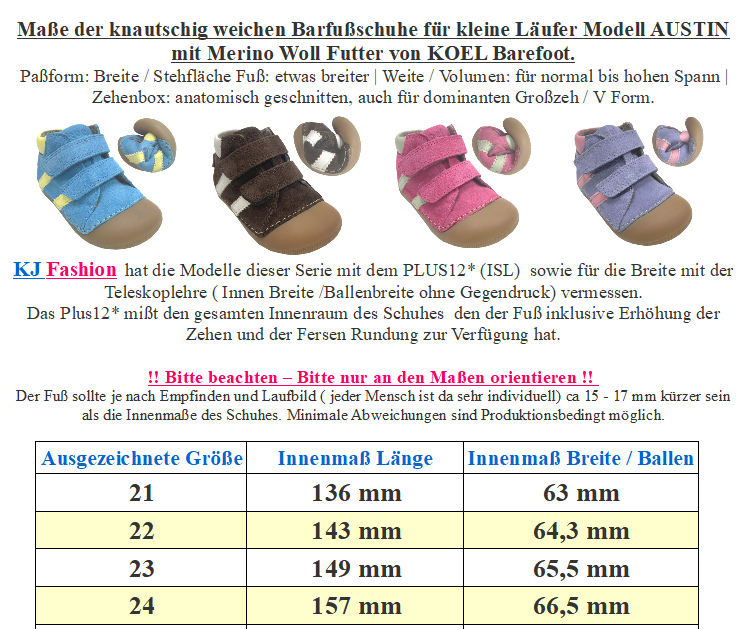 Ein optimaler Minimalschuh für die Kleinsten die sicher laufen und Ihren ersten Schuh benötigen, das sind die neuen Modelle aus ganz weichem Hydrophobiertem Leder, mit extra breitem Zehenschutz und optimal für kleine Babyspeckfüßen :-) von KOEL. !!Bitte beachten sie die Maßangaben der Schuhe, um so ein unnötiges hin und her senden zu vermeiden - bei Fragen mailen Sie uns einfach vor dem Kauf an - Ihr Team KJ Fashion !! Modell: Avery Leather 09M001.121- 170 JeansMaterial: Hydrophobiertes Leder, super soft im Griff | Innen: Glattleder | Sohle: Gummi, extra knautschigWeite (diese bezieht sich auf das Volumen im Schuh) M bis W also für normal hohen bis etwas höheren Spann geeignet | Breite (Stehfläche Fuß) normal bis etwas breiter | Mittelfuß: normal bis minimal breiter | Ferse: normal | Zehenbox: anatomisch gerundet geformt - Halbschuh bis auf den Gelenkknöchel gehend um diesen fest zu umschließen damit die Ferse beim laufen nicht im Schuh rutscht - abgepolsterter Einstieg, innen mit weichem Glattleder ausgelegt - mit Rundsenkeln zu schließen, so auch super im Umfang / der Weite / Spannhöhe zu regulieren - herausnehmbare, mit Leder bezogene Sohle - quer und längs flexible Gummisohle mit Minimalprofil, Nullabsatz und keinerlei Erhöhungen im Mittelfuß oder der Ferse Zero Drop - an der Spitze im Zehenbereich ist die Sohle weit hochgezogen als Schutzkante Der optimale Schuh für den Übergang für Kinder von KOEL Barefoot. !! Bitte beachten - für extreme Nutzung durch Bobby Car / Laufrad etc bitte geeeignete Schutzkappen über die Schuhe ziehen - da diese dafür nicht ausgelegt sind !!